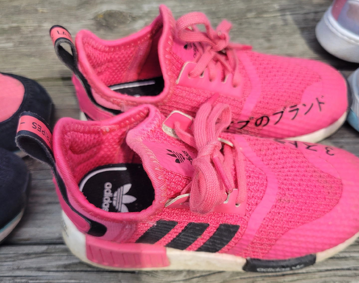 Selling a pair of Adidas NMD R1 sneakers in pink! They are in good condition and ready for a new home. Perfect for adding a pop of colour to your outfit! Toddler size 9 US
