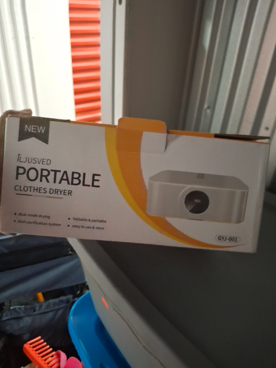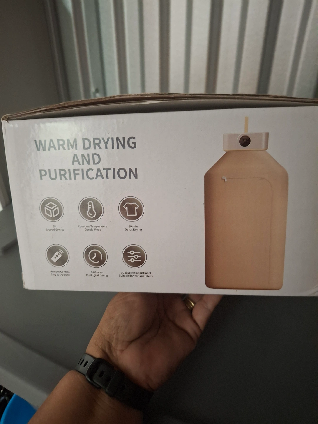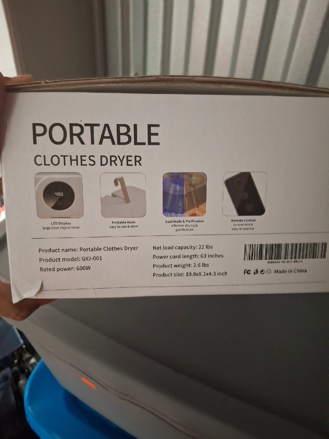 Selling a brand new, in-box portable clothes dryer! It features dual mode drying and a dual purification system. It's foldable and portable for easy storage. The box includes an LED display with a large clear digital timer and a foldable hook for easy use. The product size is 10.8x6.1x4.3 inches