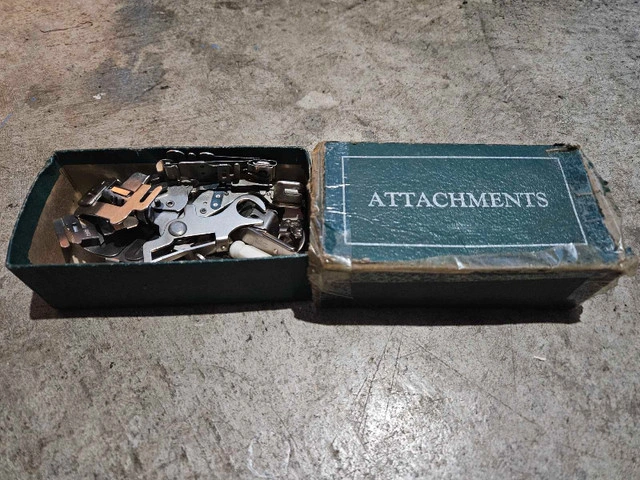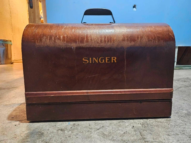 For sale: Singer 128 sewing machine (1939), made in Canada. Classic black cast-iron body with gold filigree decals and sturdy design. Fully mechanical, with foot pedal and built-in light, runs smoothly. Includes the original green attachment box with all accessories and the original manual. Heavy-duty and collectible perfect for use or display. Price: $375 OBO.