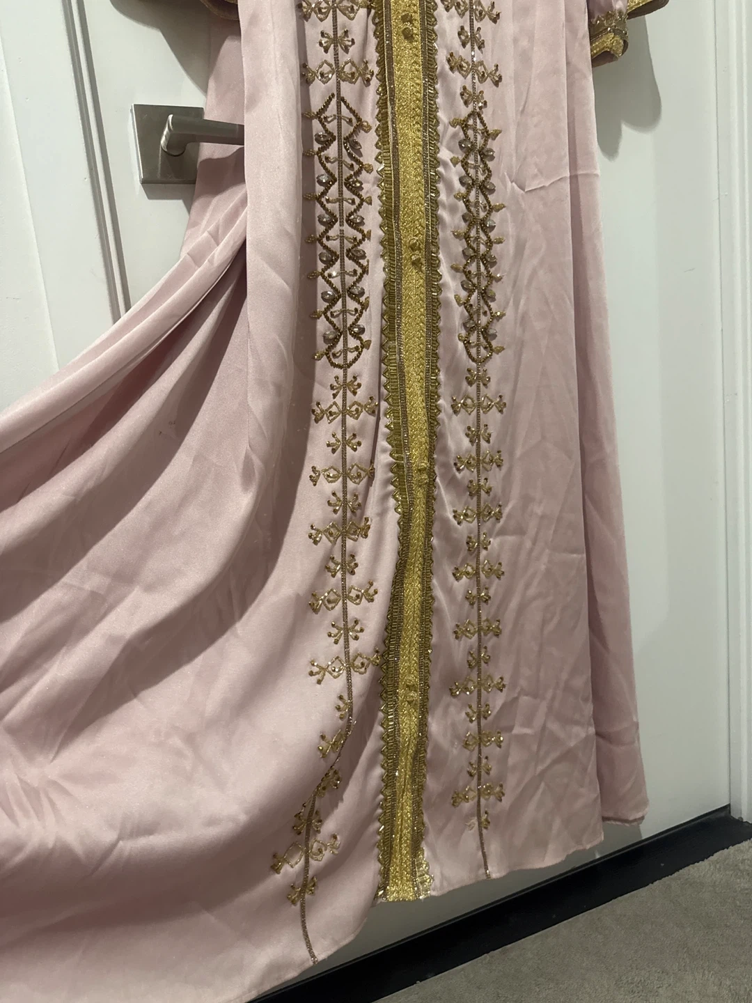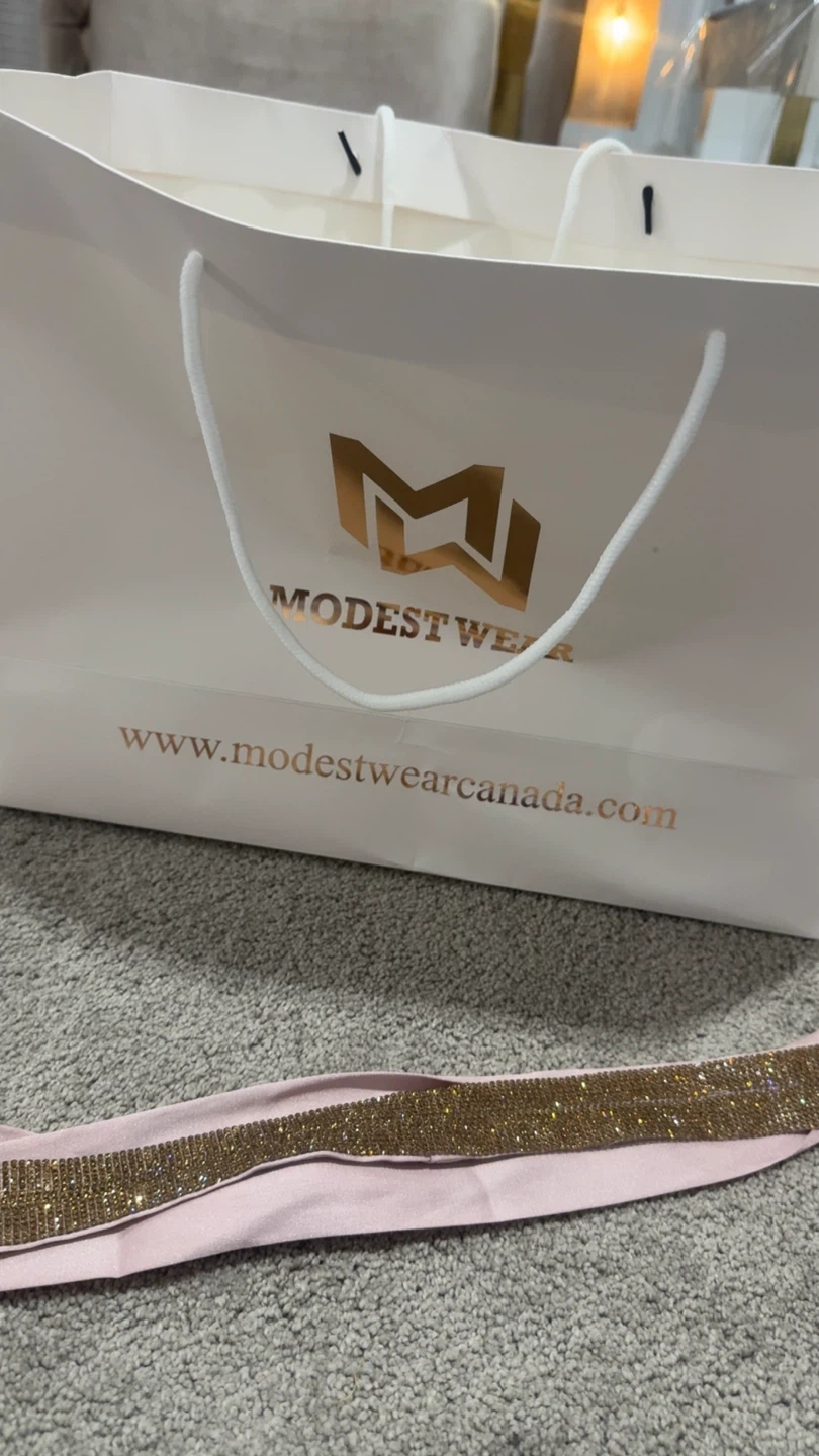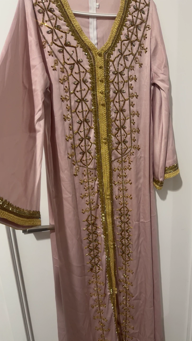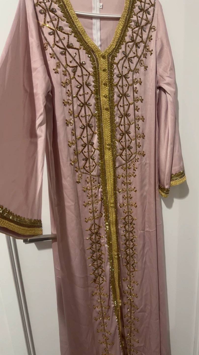 Selling a lovely pink kaftan from Modest Wear Canada! It features beautiful gold embellishments and comes with a matching belt. Perfect for a special occasion or a stylish everyday look. Comes with the original bag!