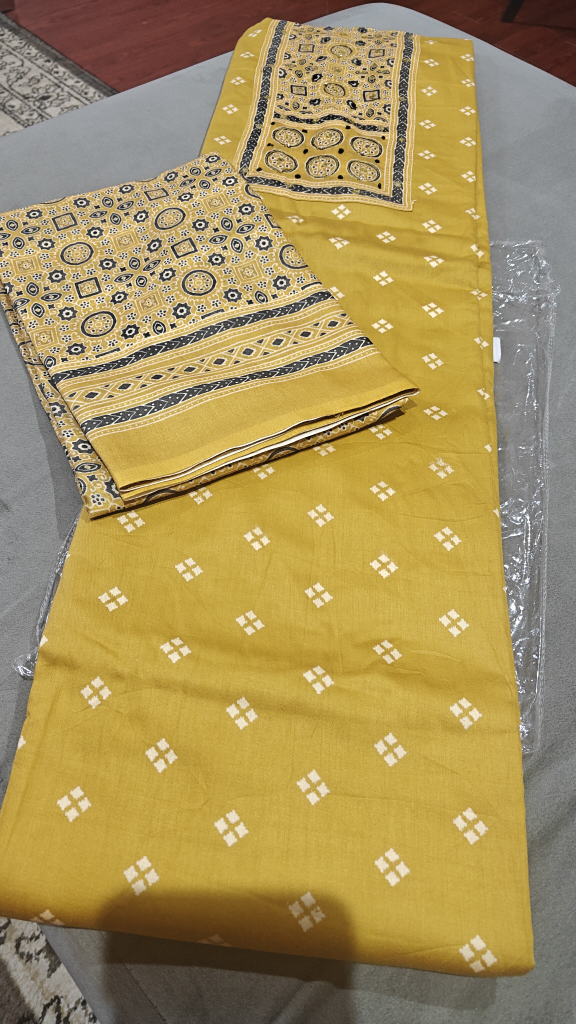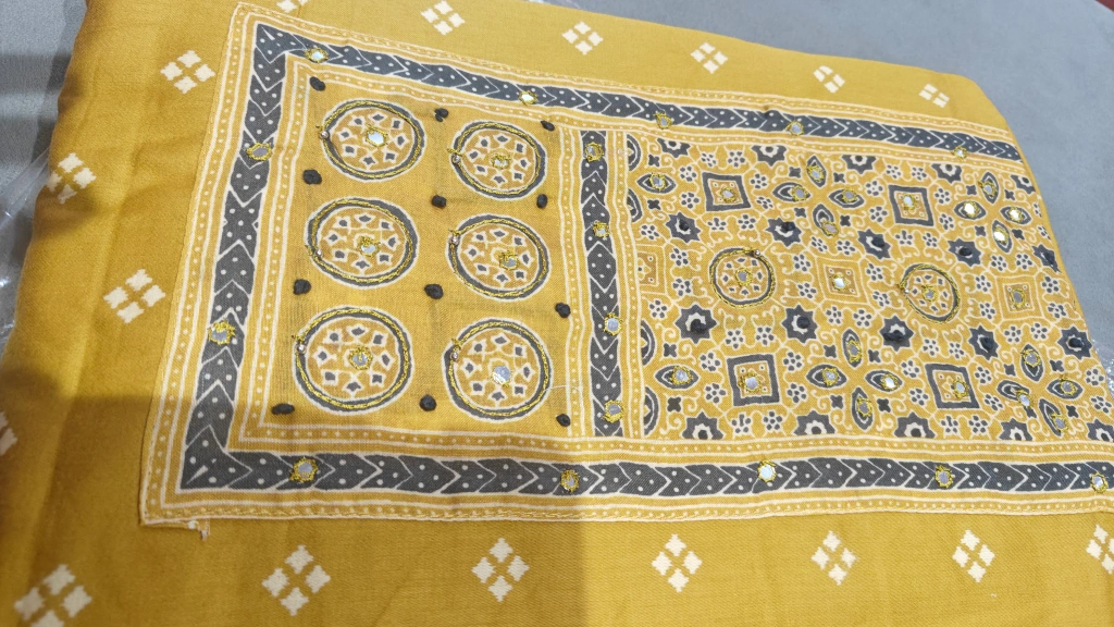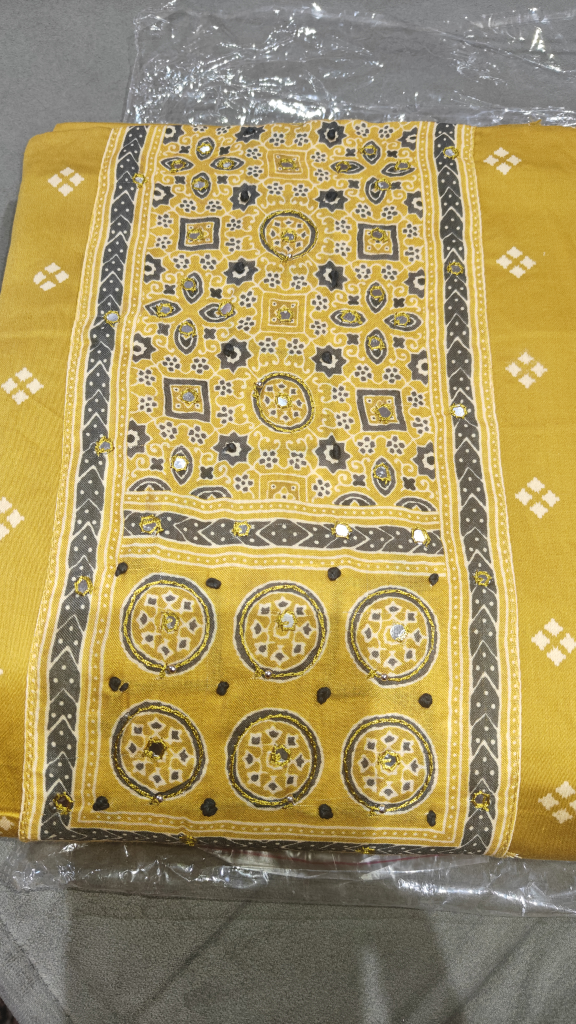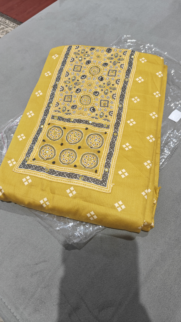 Here's a beautiful unstitched salwar kameez suit in a lovely mustard yellow colour. The fabric features traditional patterns and mirror work...