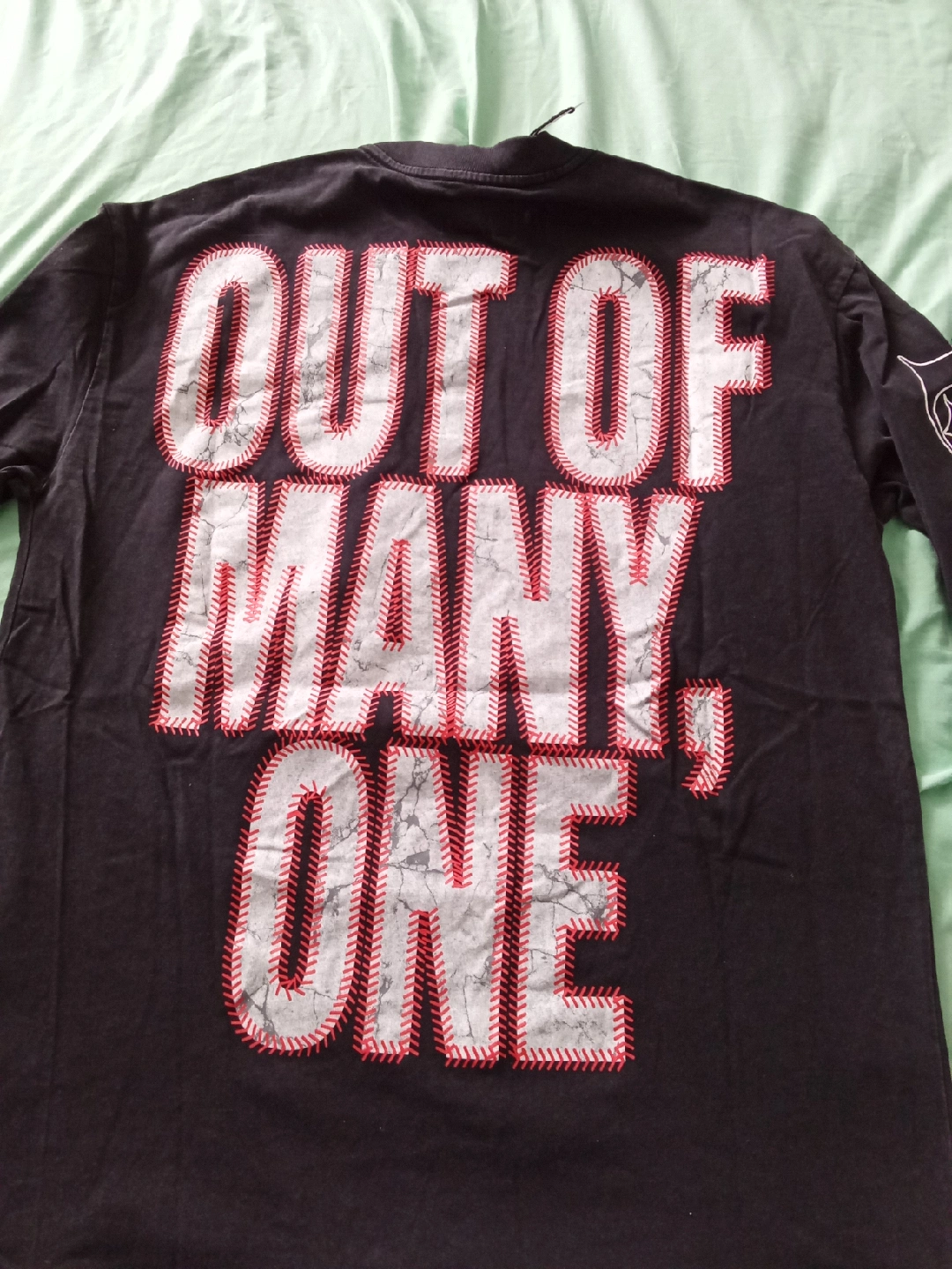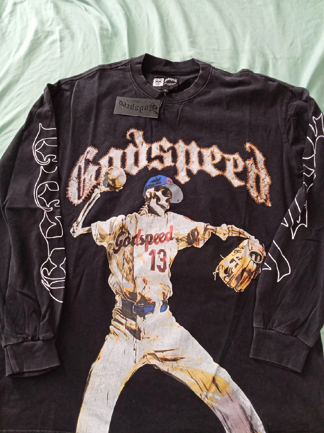 Selling a Godspeed long sleeve shirt! It features a unique design with a skeleton baseball player on the front and the text "OUT OF MANY, ONE" on the back. The shirt has a cool, distressed look.