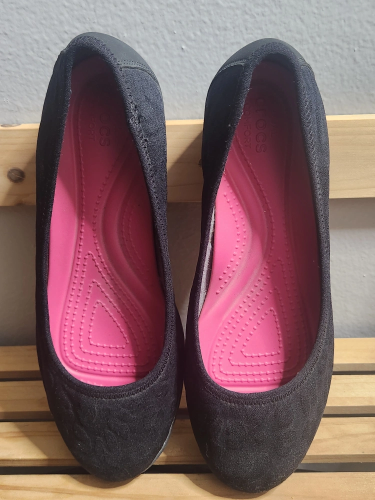 Selling a pair of black Crocs wedge size 7 shoes. They have a comfortable footbed and are in great condition. Perfect for everyday wear! The shoes turned out too big for me. Worn a few minutes only because it keeps slipping off and I just gave up. I normally wear size 7 for dress shoes but this is big for me.