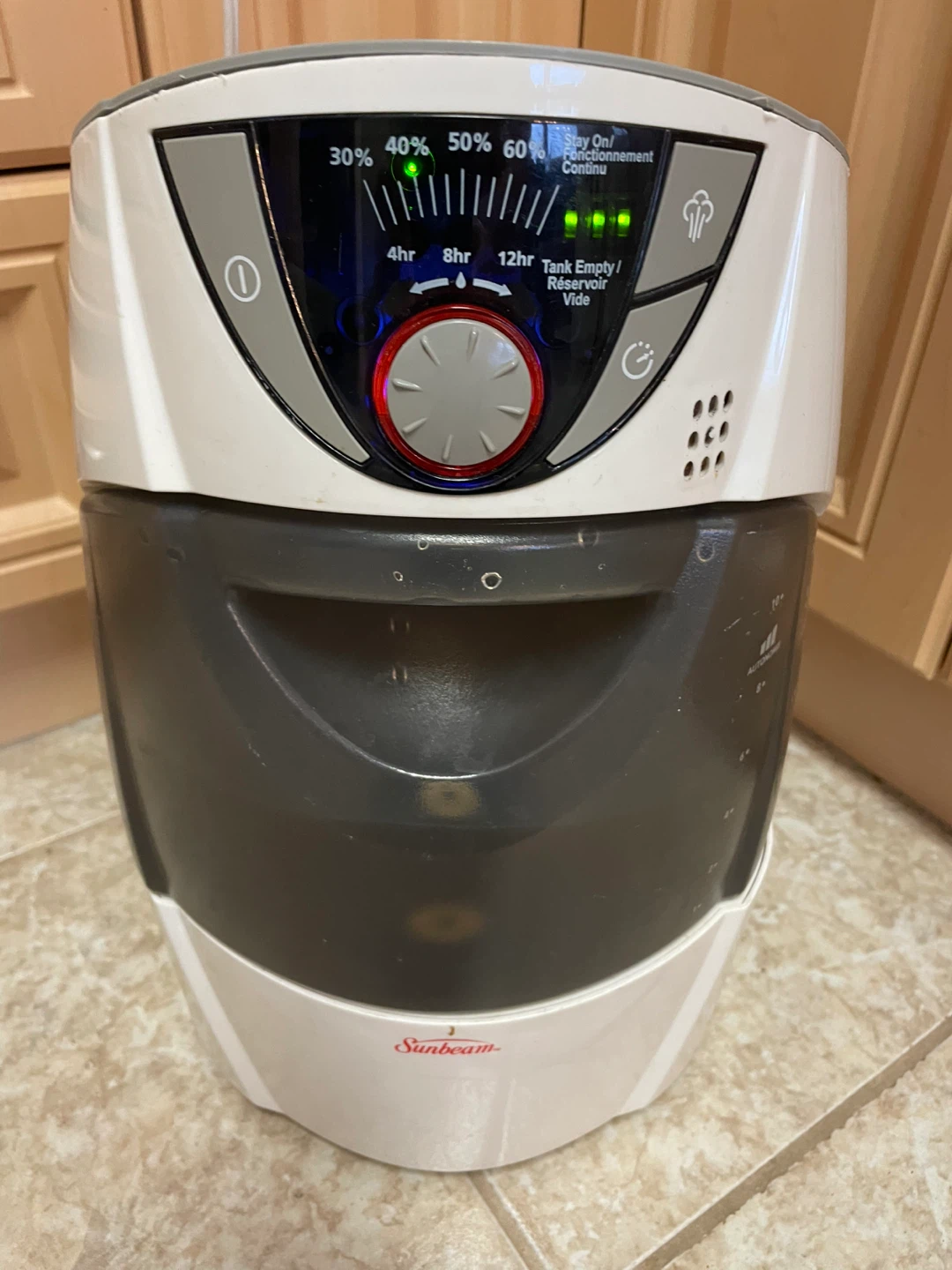 Selling a Sunbeam humidifier. It has different settings for humidity levels (30%, 40%, 50%, 60%) and run times (4hr, 8hr, 12hr). Also has a tank empty indicator.