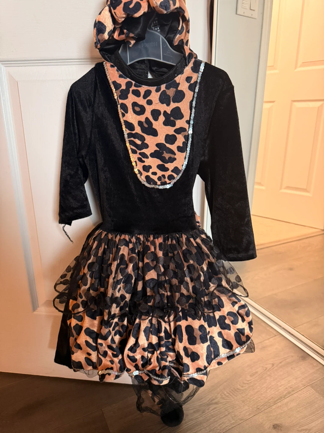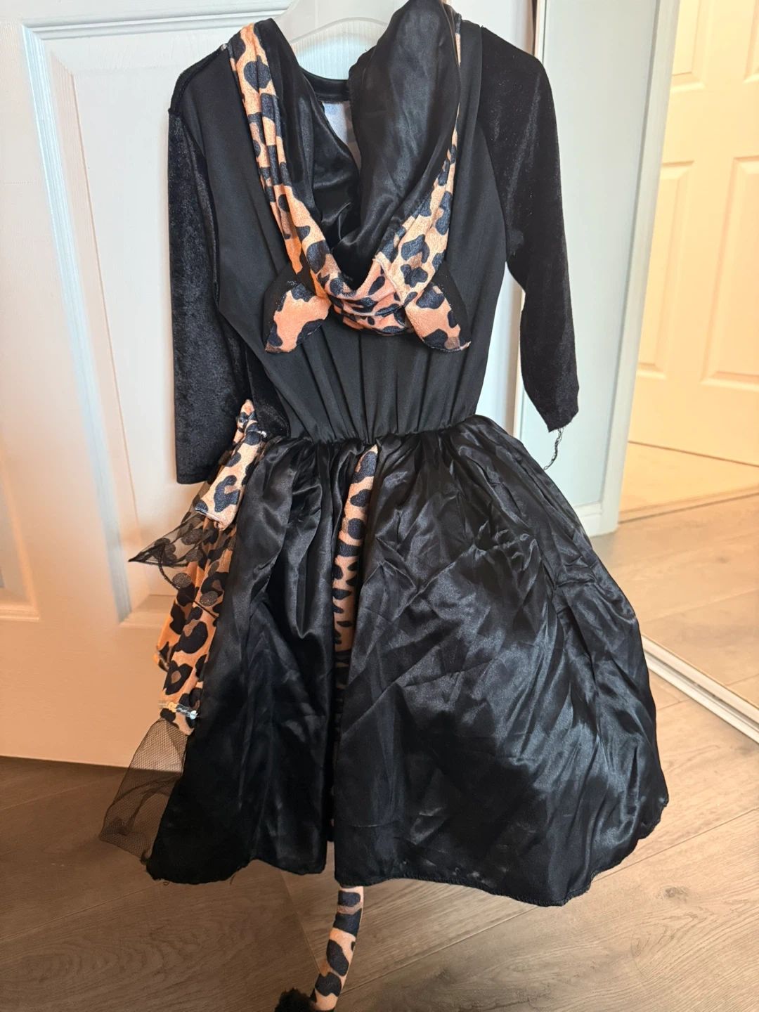 This adorable girl's costume dress features a black bodice with long sleeves and a full skirt with leopard print accents. It's perfect for dress-up, Halloween, or any special occasion! The dress is in great condition and ready for a new home