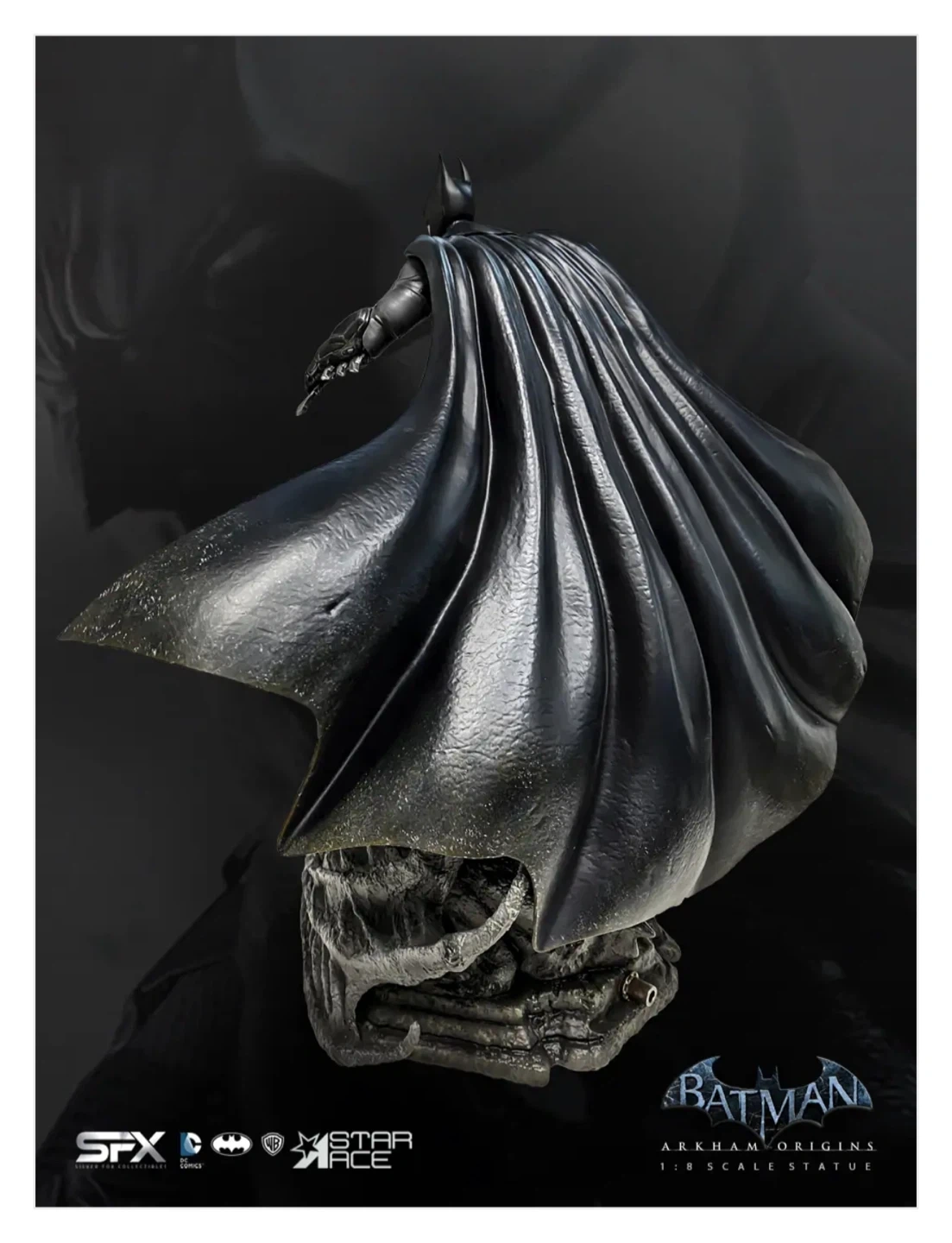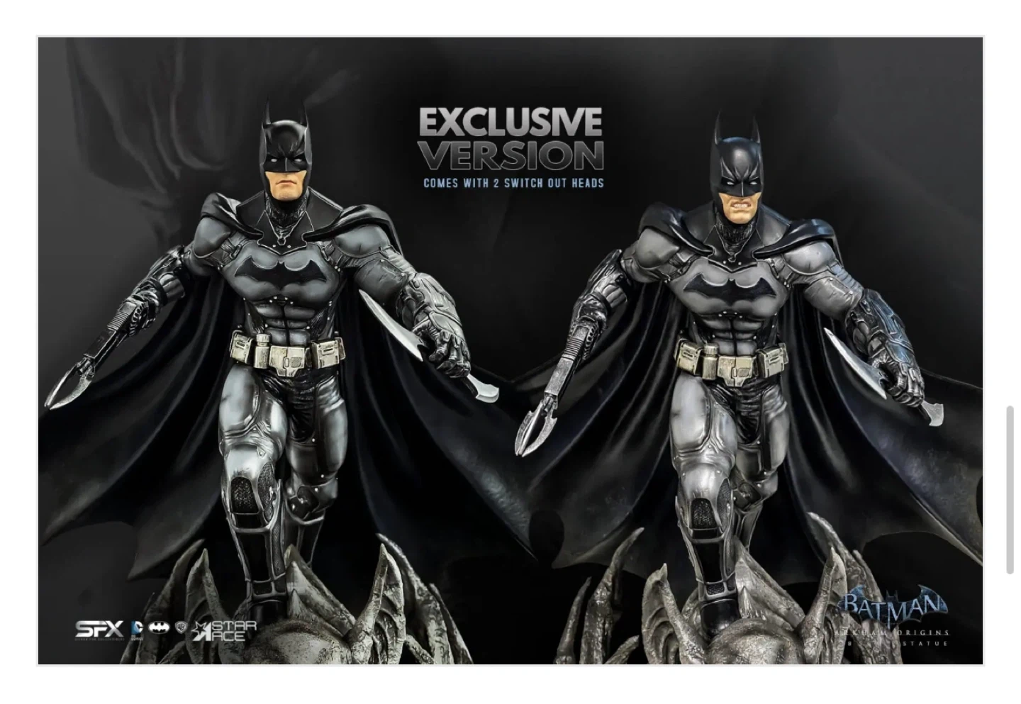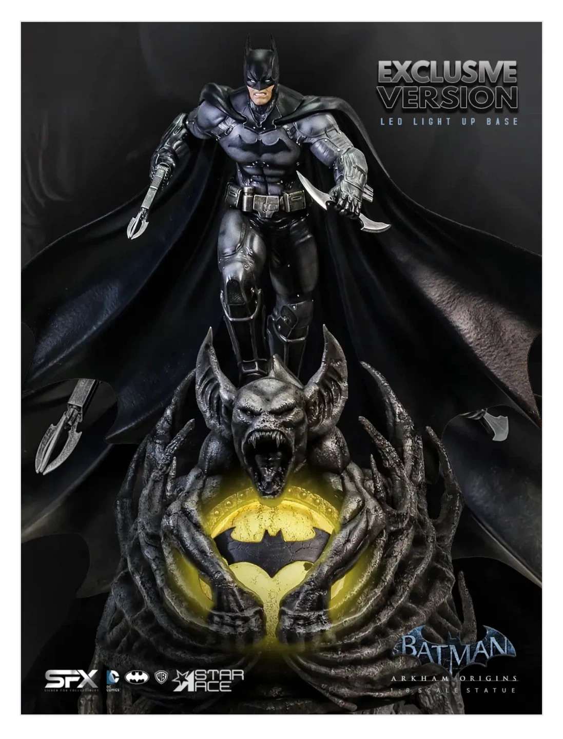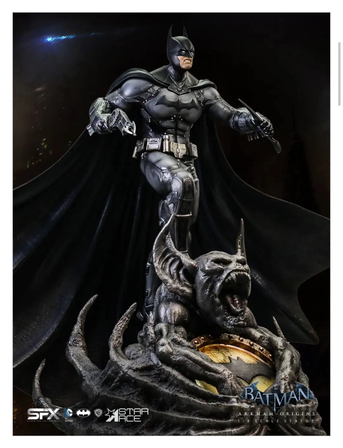 Selling an open box (New Figure Inside) Batman Arkham Origins 1/8 scale statue. This statue includes an exclusive light-up base, which has the bat signal surrounded by Man Bat claws and wings. The statue also has an additional head and comes complete with Batman holding the Bat-a-rang and the Bat Claw in the other. It also includes a Mini Print & Authenticity Card. This is a fully licensed product and is a limited edition 058/500