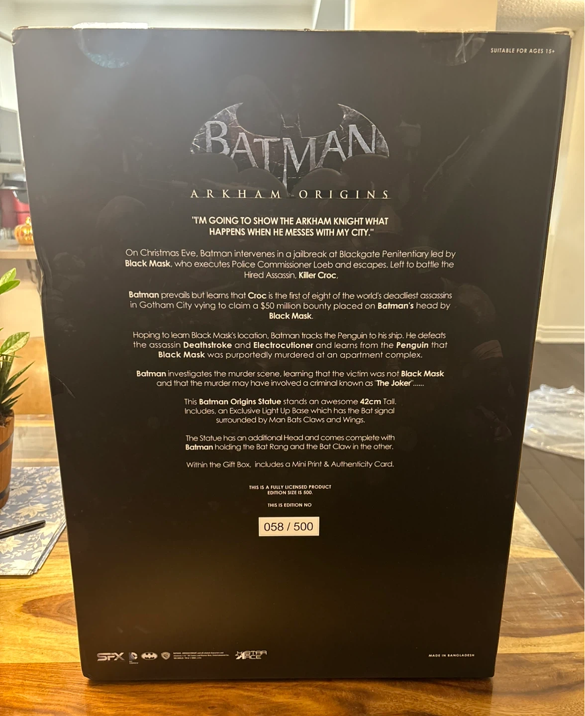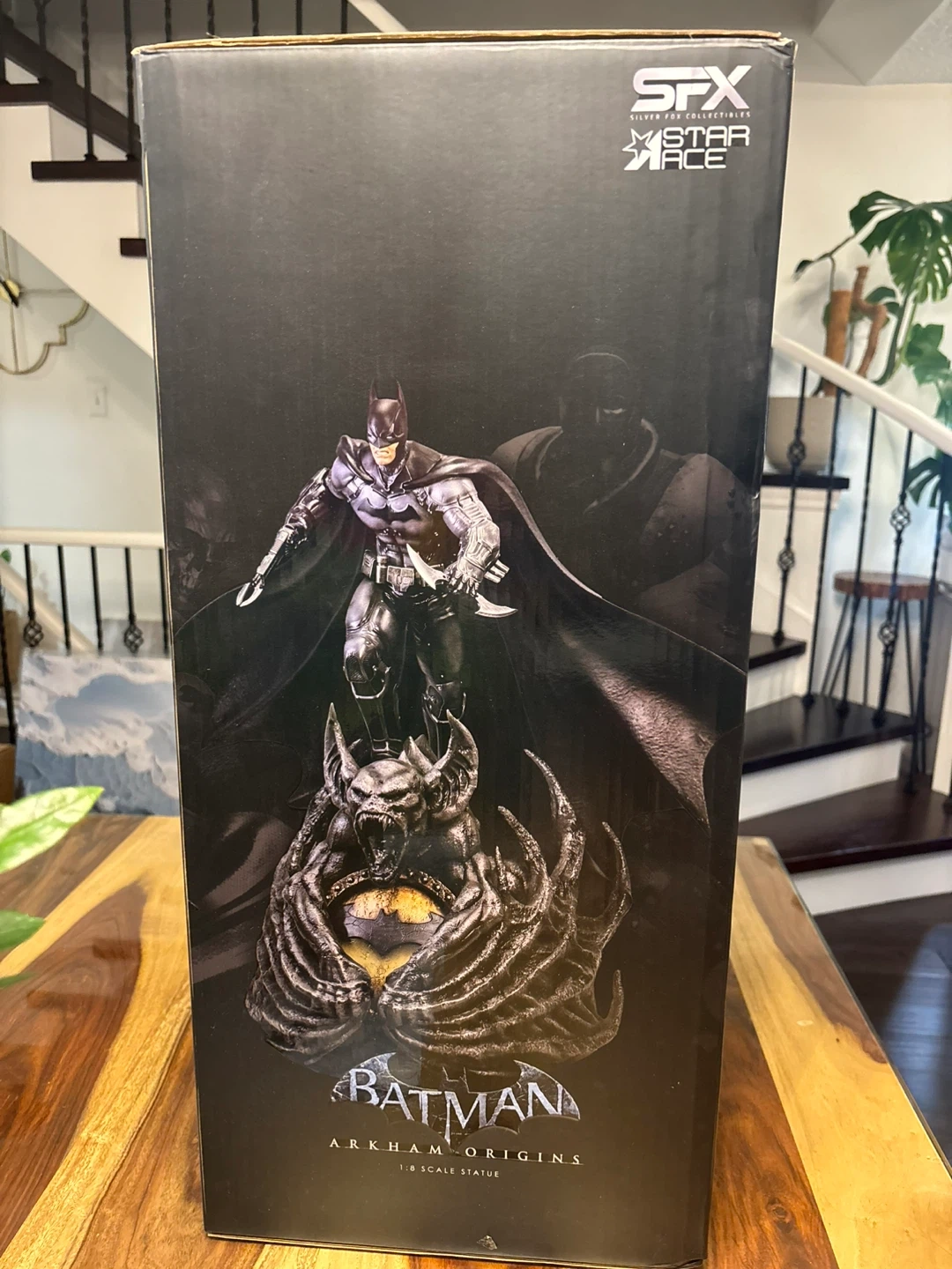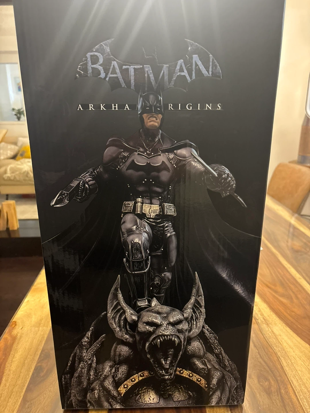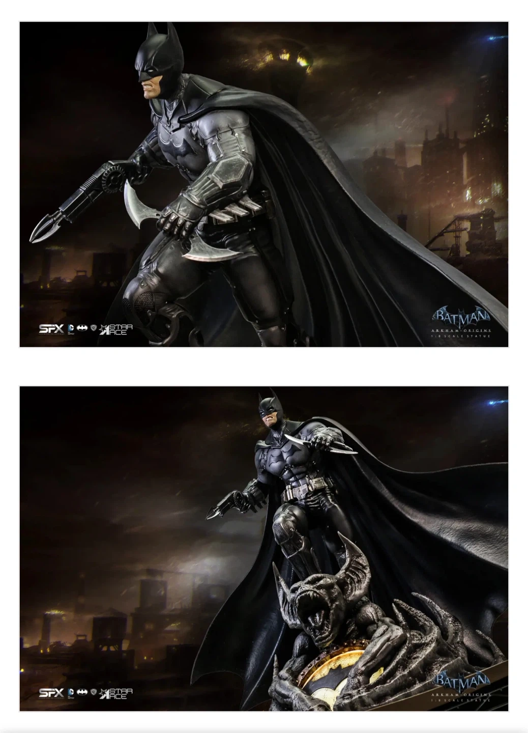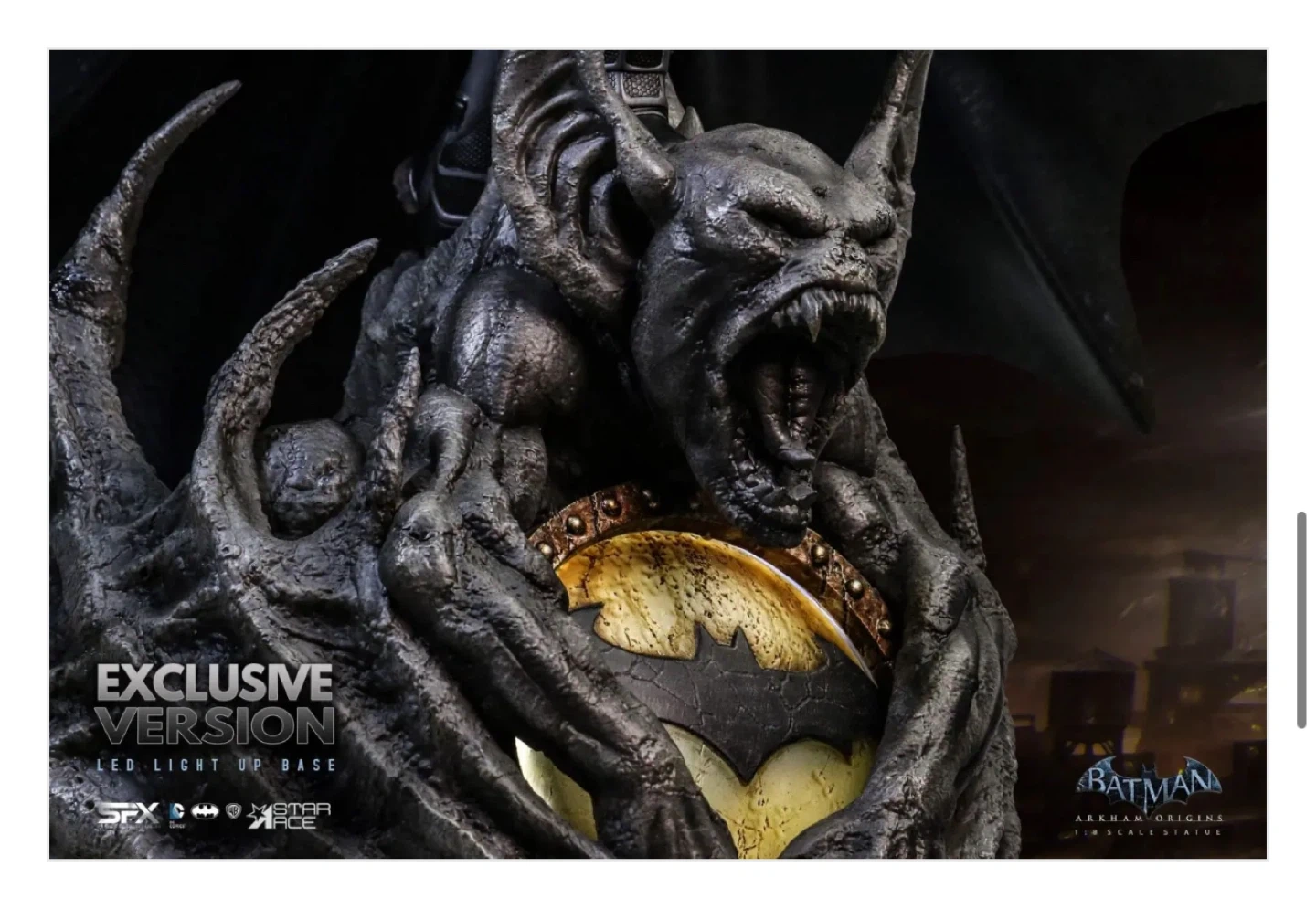 Selling an open box (New Figure Inside) Batman Arkham Origins 1/8 scale statue. This statue includes an exclusive light-up base, which has the bat signal surrounded by Man Bat claws and wings. The statue also has an additional head and comes complete with Batman holding the Bat-a-rang and the Bat Claw in the other. It also includes a Mini Print & Authenticity Card. This is a fully licensed product and is a limited edition 058/500