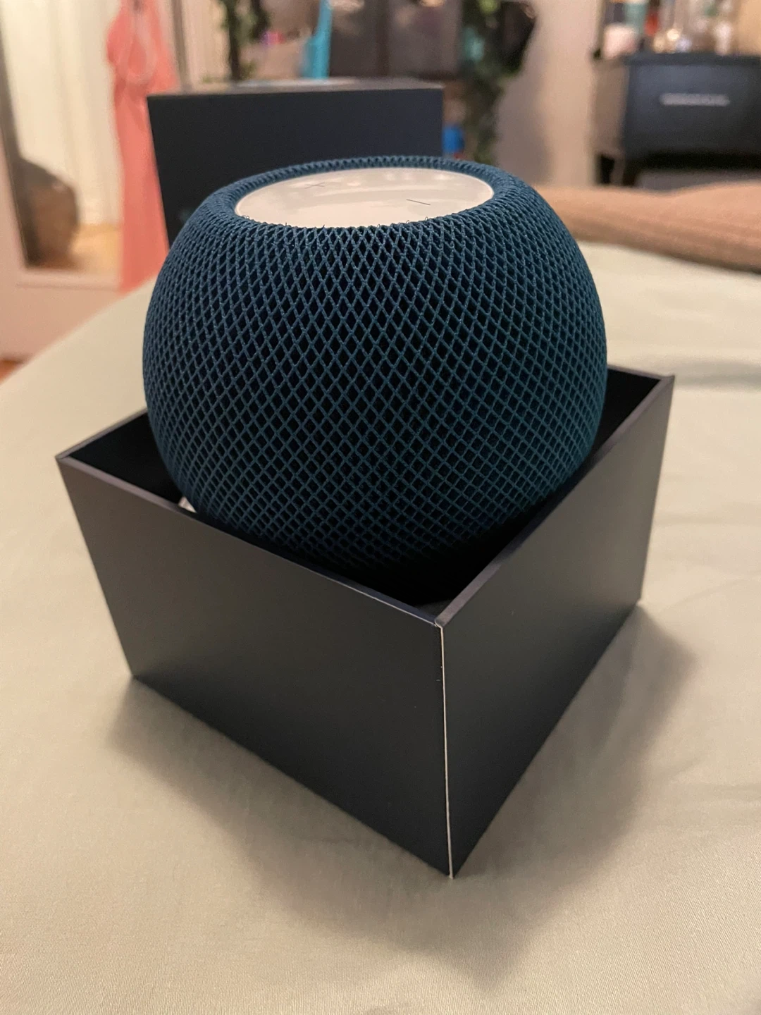 Never been used blue Apple HomePod mini for sale. It comes with the original box and all included components, including the charger and instructions. Enjoy room-filling, 360-degree sound with Apple-designed audio. Pair two HomePod mini speakers for stereo sound. Use with Apple TV 4K. Siri helps the family get things done. Intercom to stay connected. Control your smart home