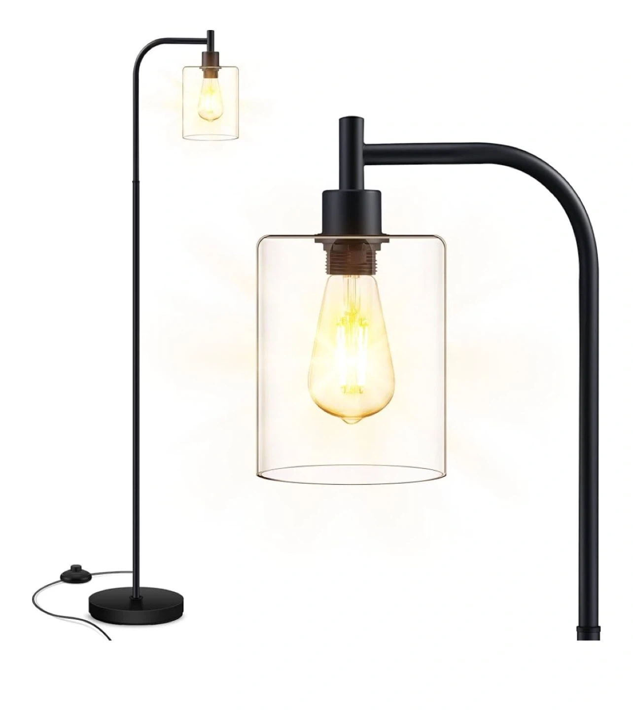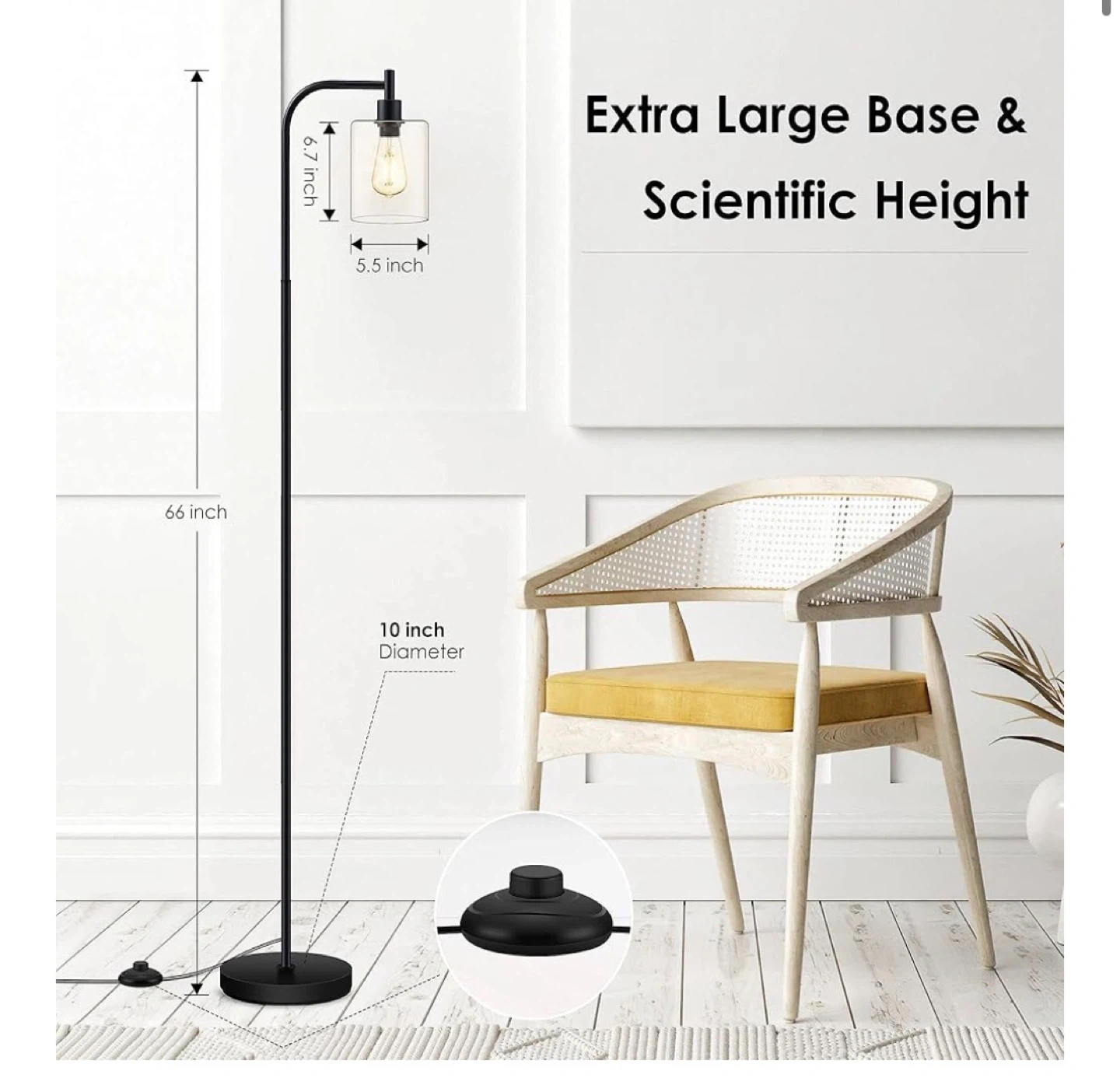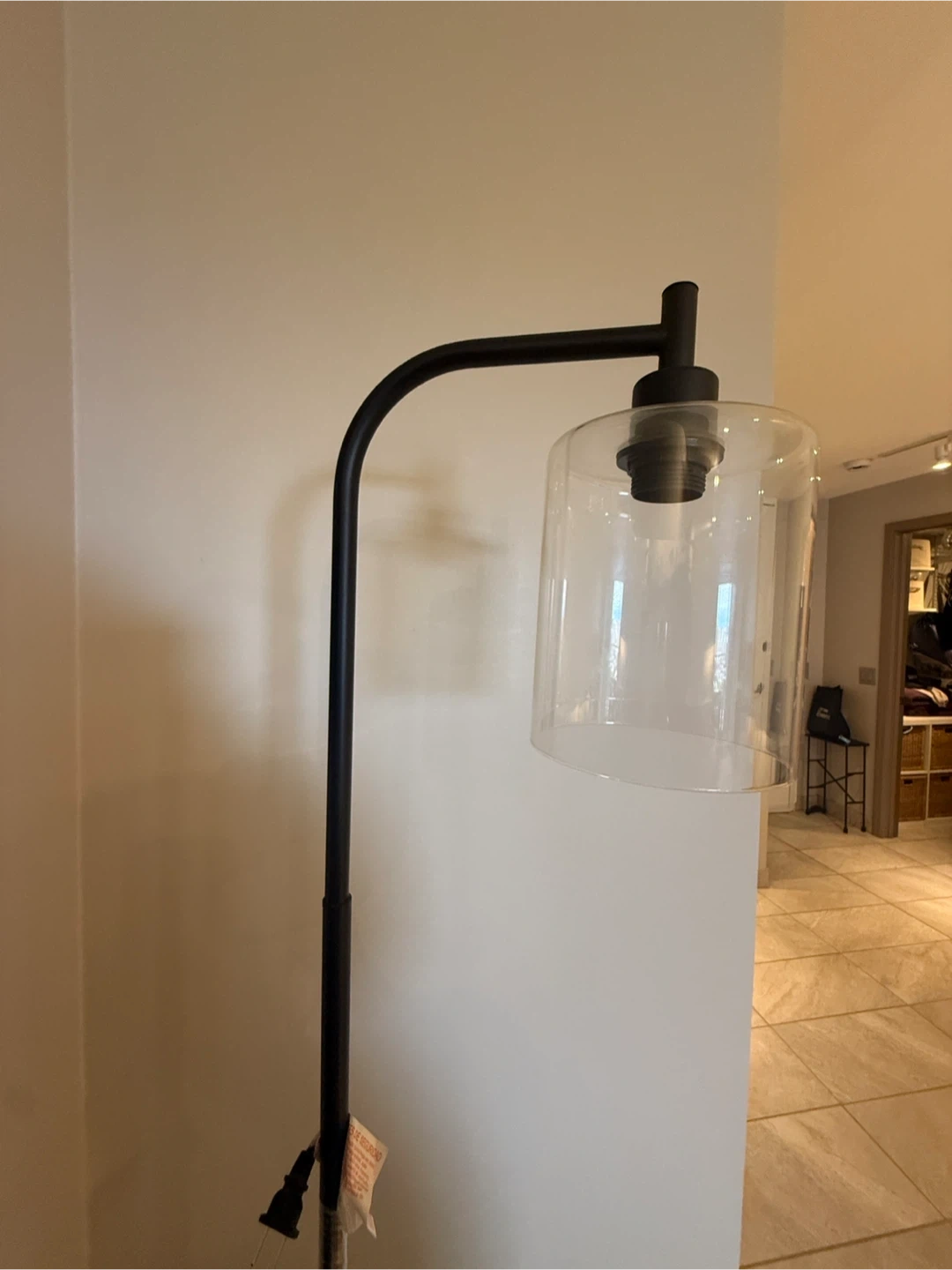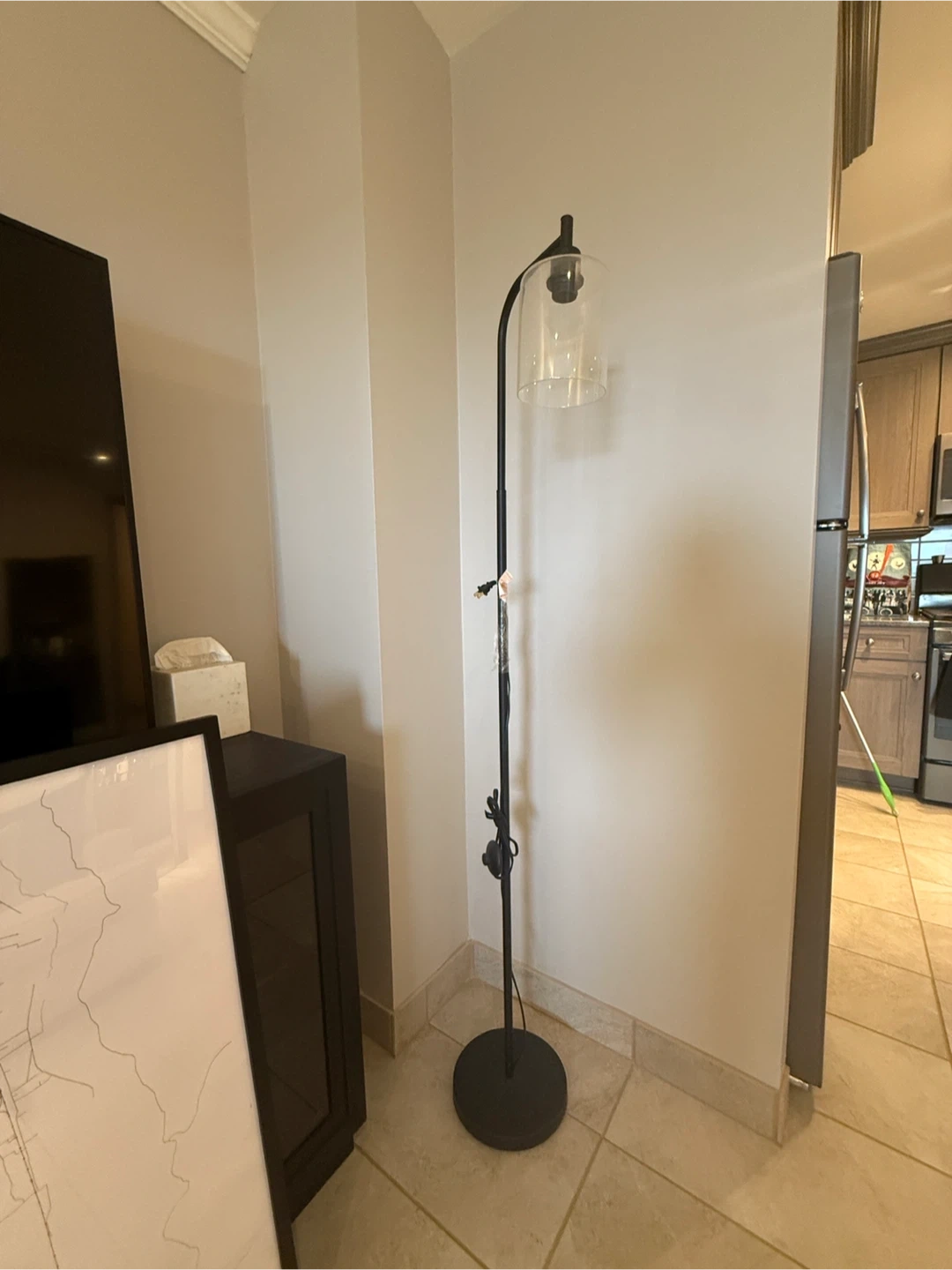 Selling a stylish black floor lamp with a clear glass shade! It stands at 66 inches tall and has an extra-large base for stability. The shade dimensions are approximately 6.7 inches in height and 5.5 inches in width, with a base diameter of 10 inches. It's in great condition and would look great in any room.