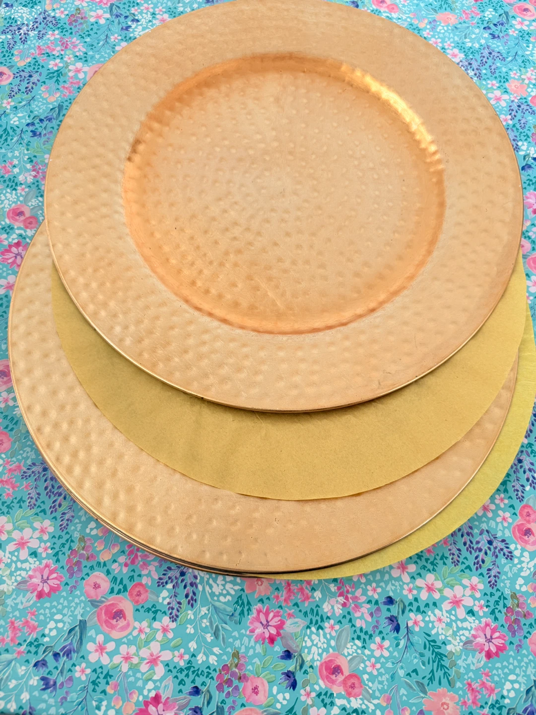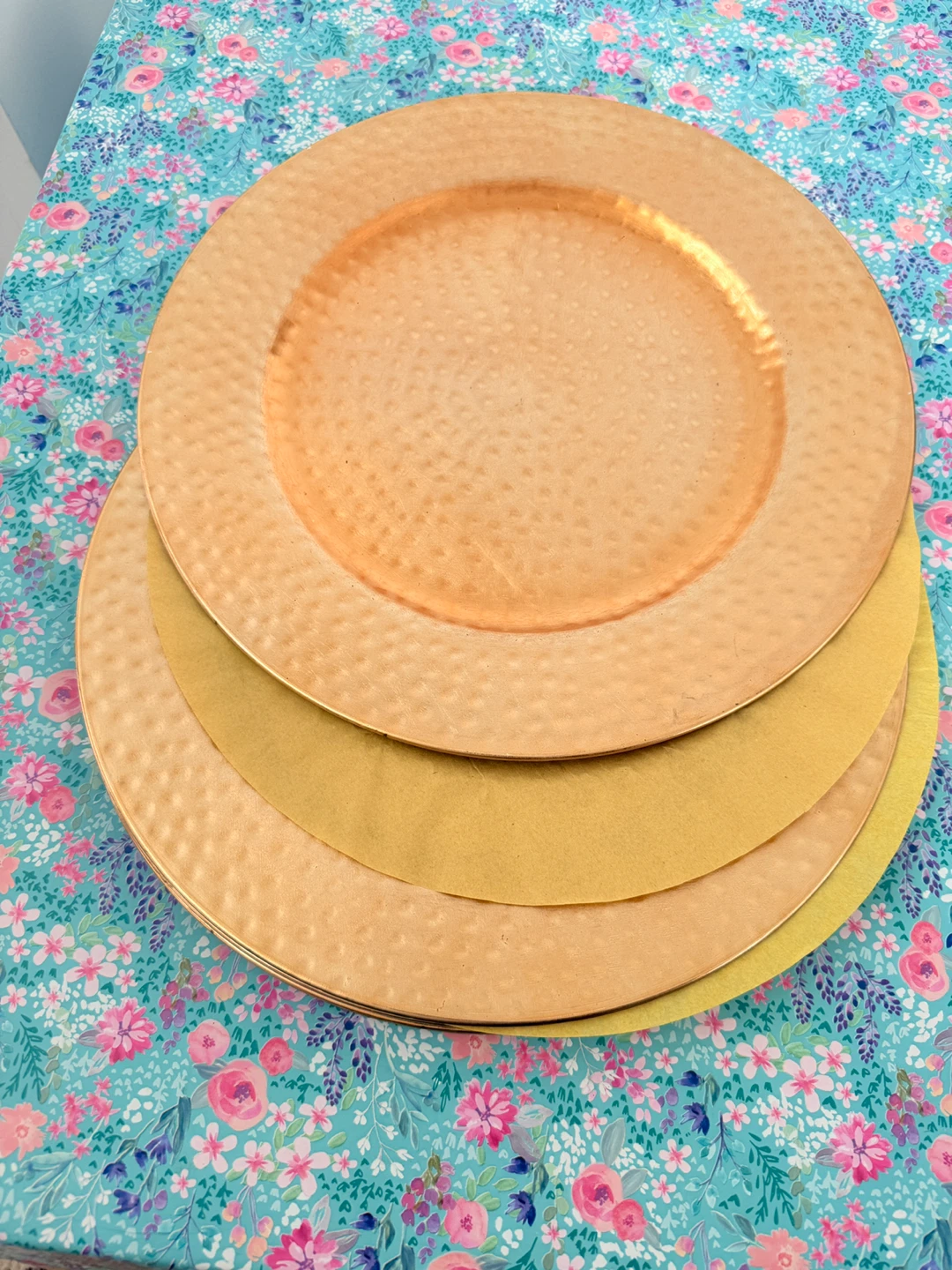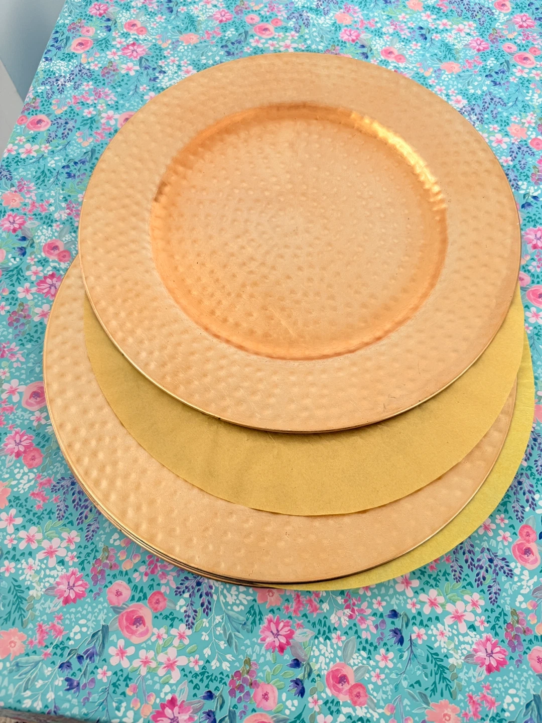 Brand New Selling a set of four gold plastics charger plates! They have a hammered texture and would look great for a special occasion or to add a bit of glam to your table setting