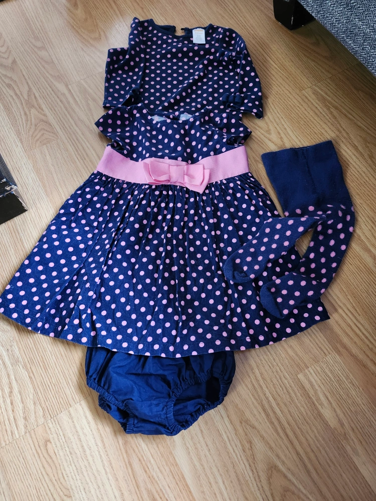 navy blue with pink dots and bow in front of dress size 6-12 the tights are size 0-6 top has one bow on the sleeves its like new all machine wash All from Gymboree from pet and smoke free home cash only $20.00