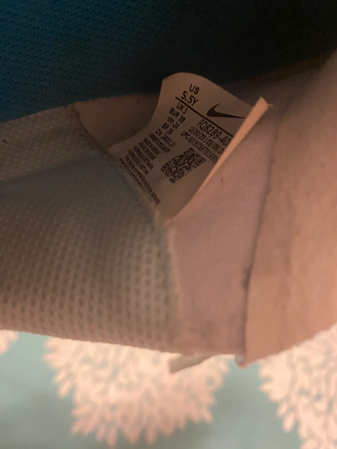 Selling a pair of Nike soccer shoes, model number FQ8289-400. They are a US size 5.5Y. The shoes are white with blue accents and the Nike logo. Great for playing soccer!