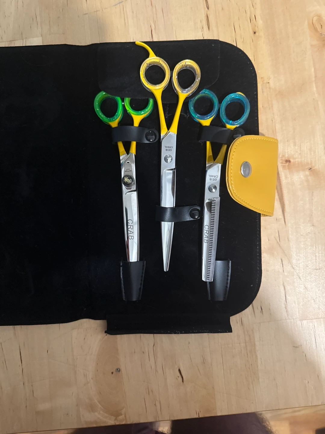 Here is a set of CRAB professional hairdressing scissors. The set includes three different pairs of scissors with colorful handles, all neatly arranged in a black carrying case. The scissors appear to be in good condition and ready for use!