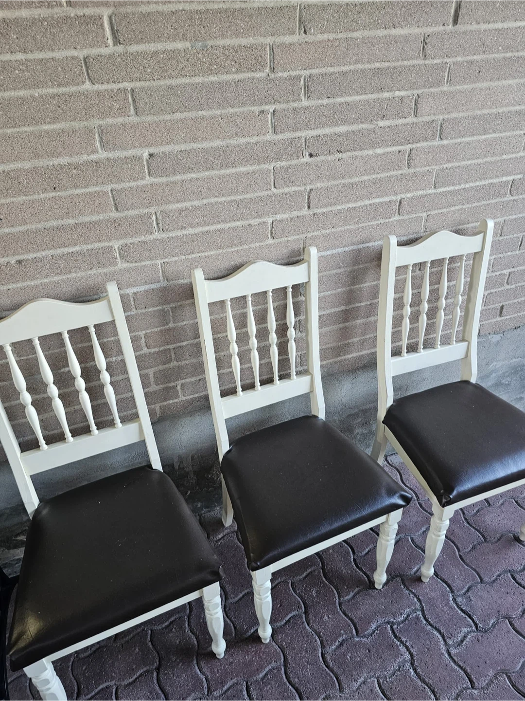 Selling a set of three dining chairs. They feature a white frame and a dark seat. Perfect for adding a touch of classic style to your dining area!