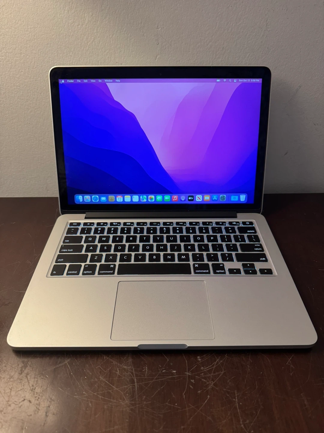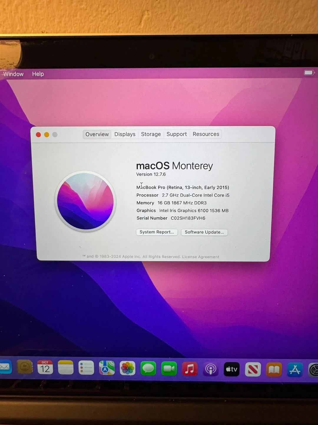 Selling a MacBook Pro (Retina, 13-inch, Early 2015) running macOS Monterey version 12.7.6. It has a 2.7 GHz Dual-Core Intel Core i5 processor, 16 GB of 1867 MHz DDR3 memory, and Intel Iris Graphics 6100 1536 MB graphics. It also has 256 GB Solid State PCI Express Drive and Built-in Retina Display 13.3-inch (2560 x 1600)