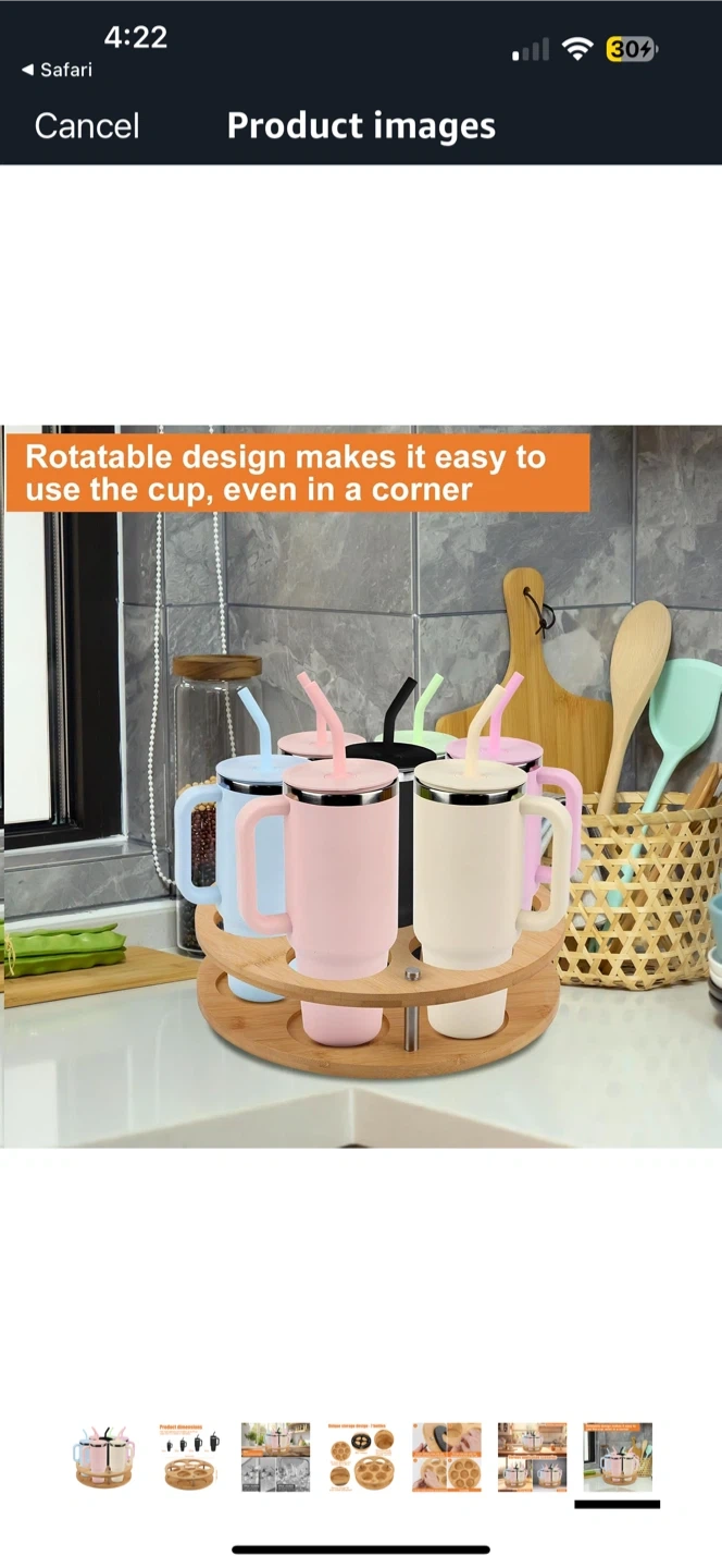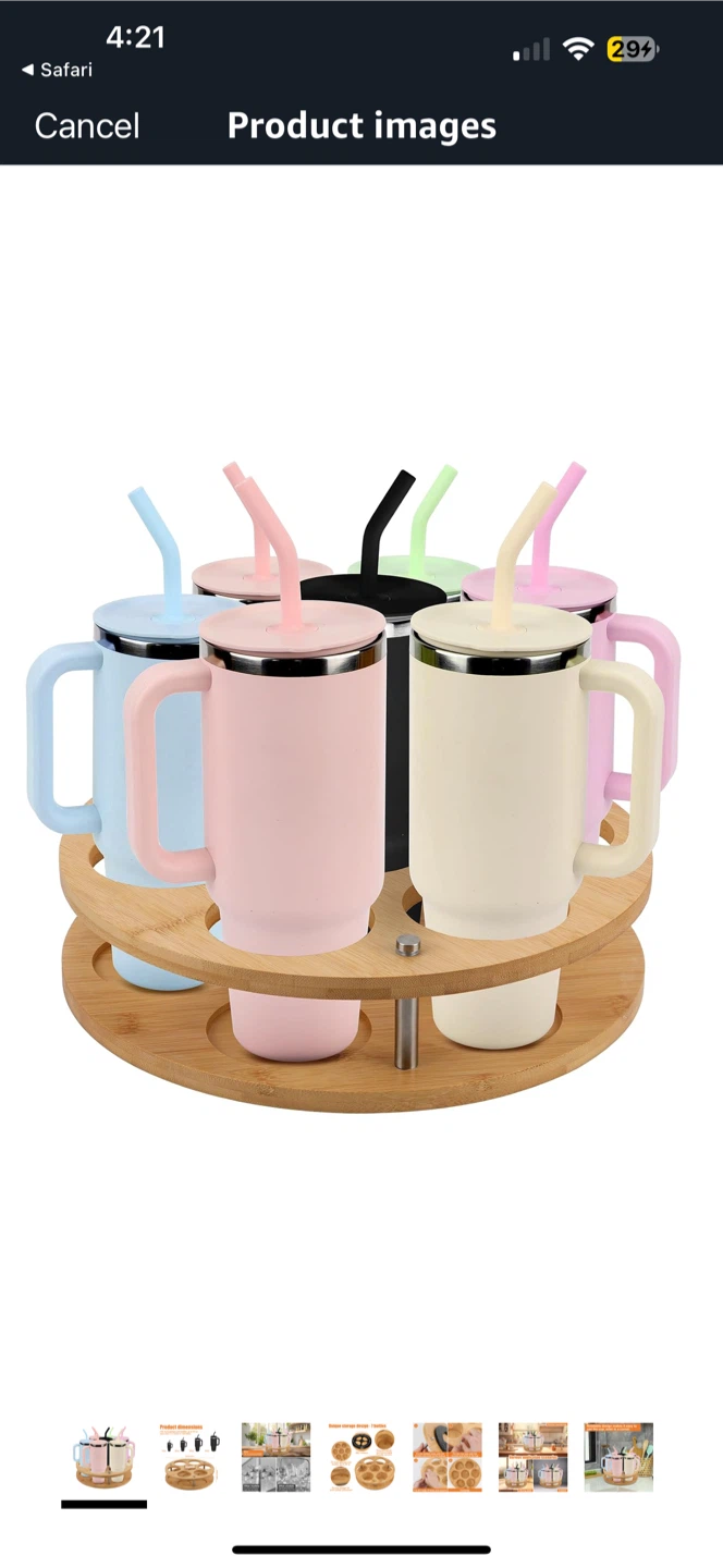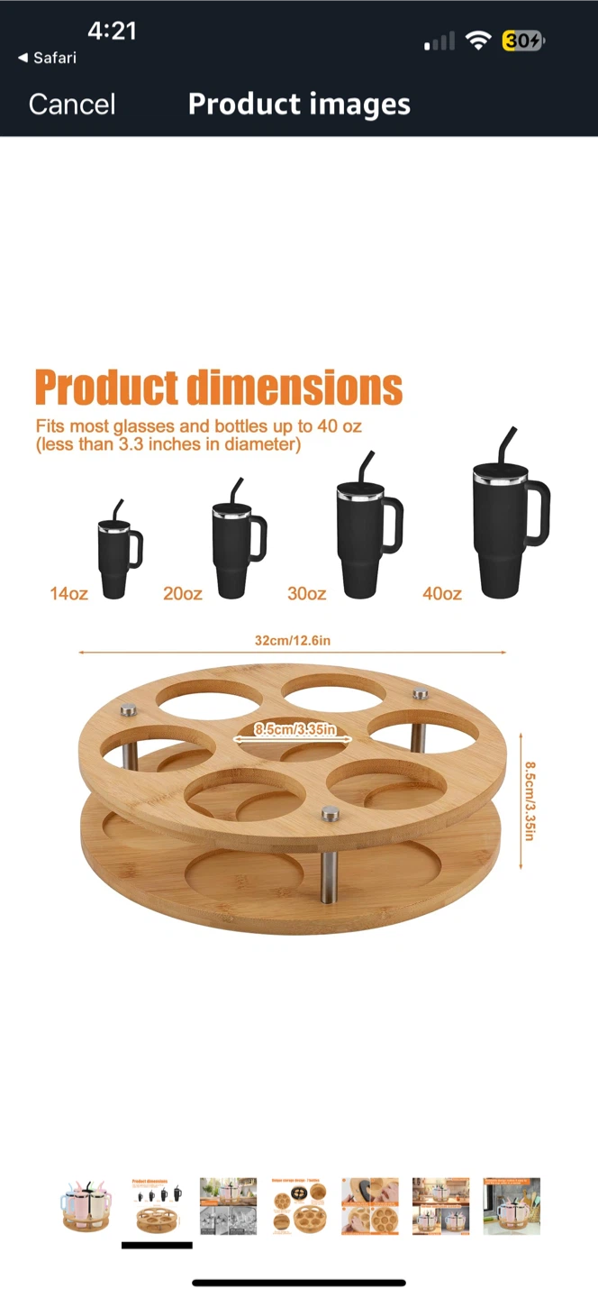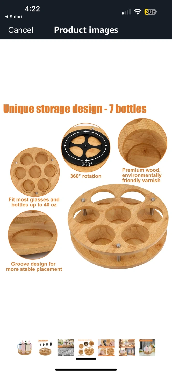 This rotating bamboo cup holder stand is perfect for organizing your cups and bottles! It can hold up to 7 bottles or glasses. It fits most glasses and bottles up to 40 oz (less than 3.3 inches in diameter). It features premium wood with an environmentally friendly varnish. The design allows for 360° rotation for easy access