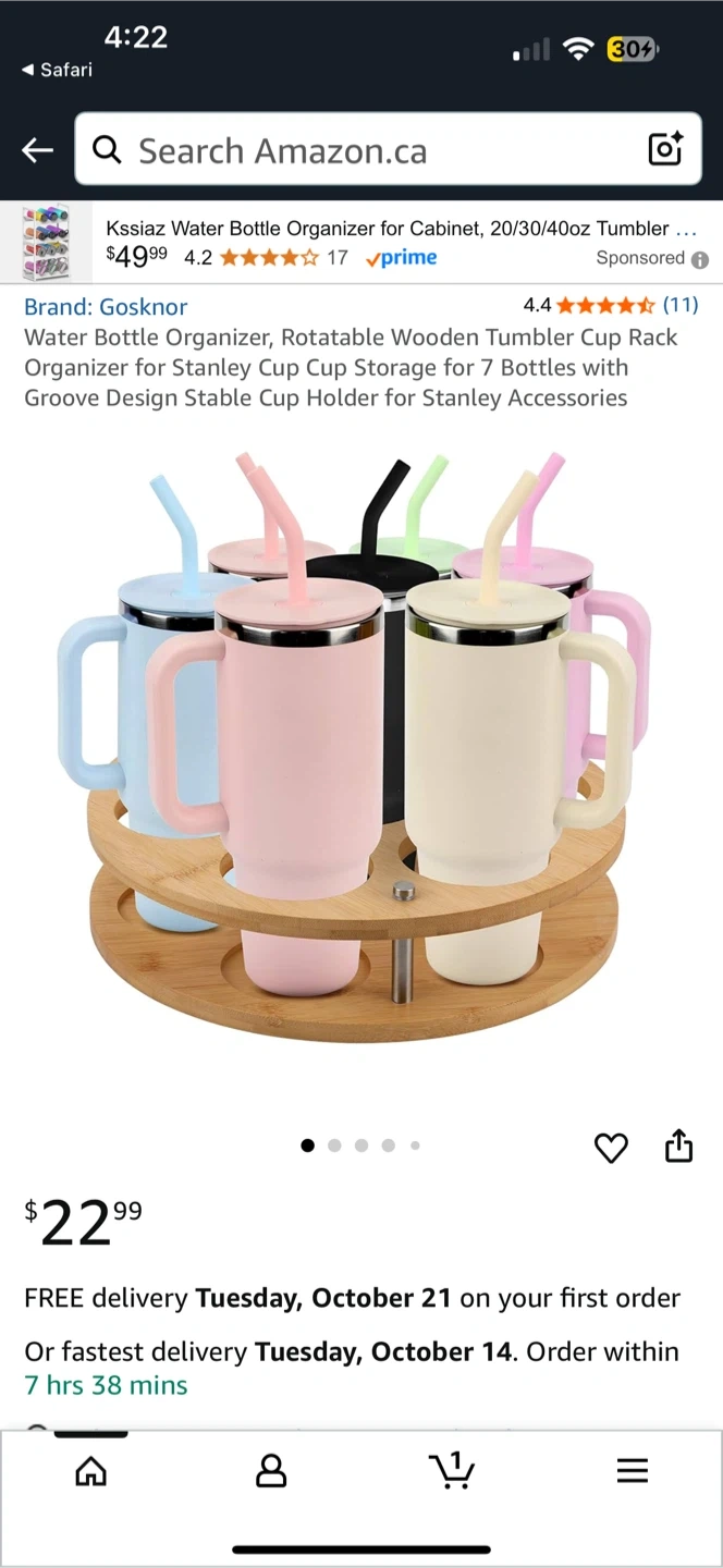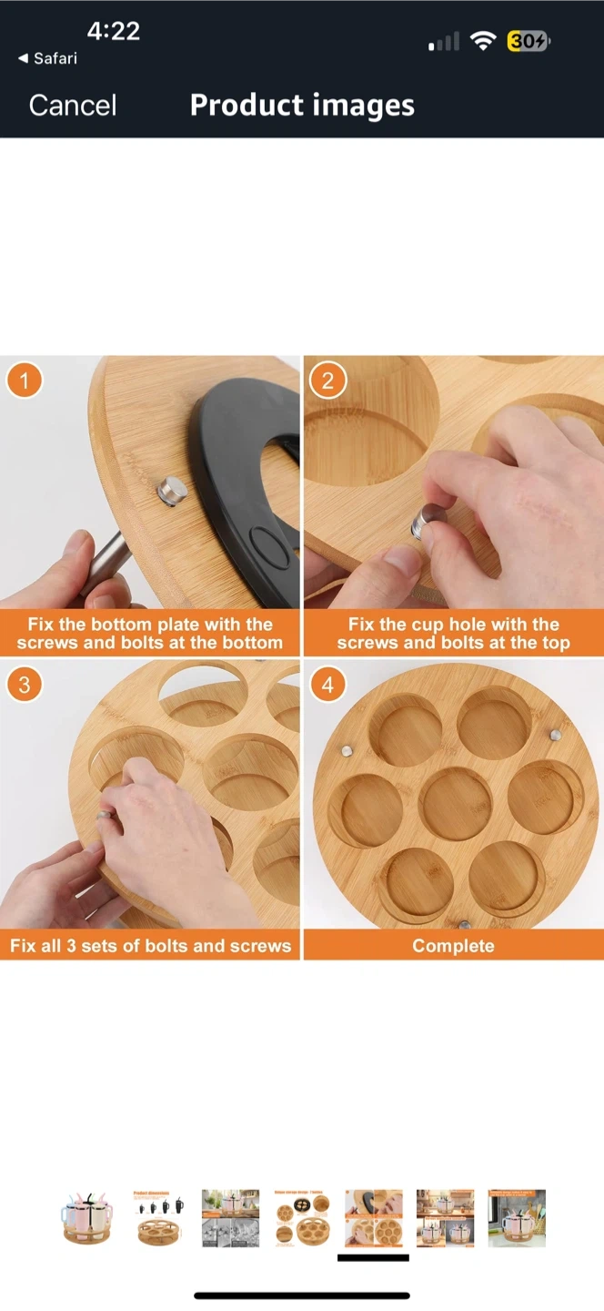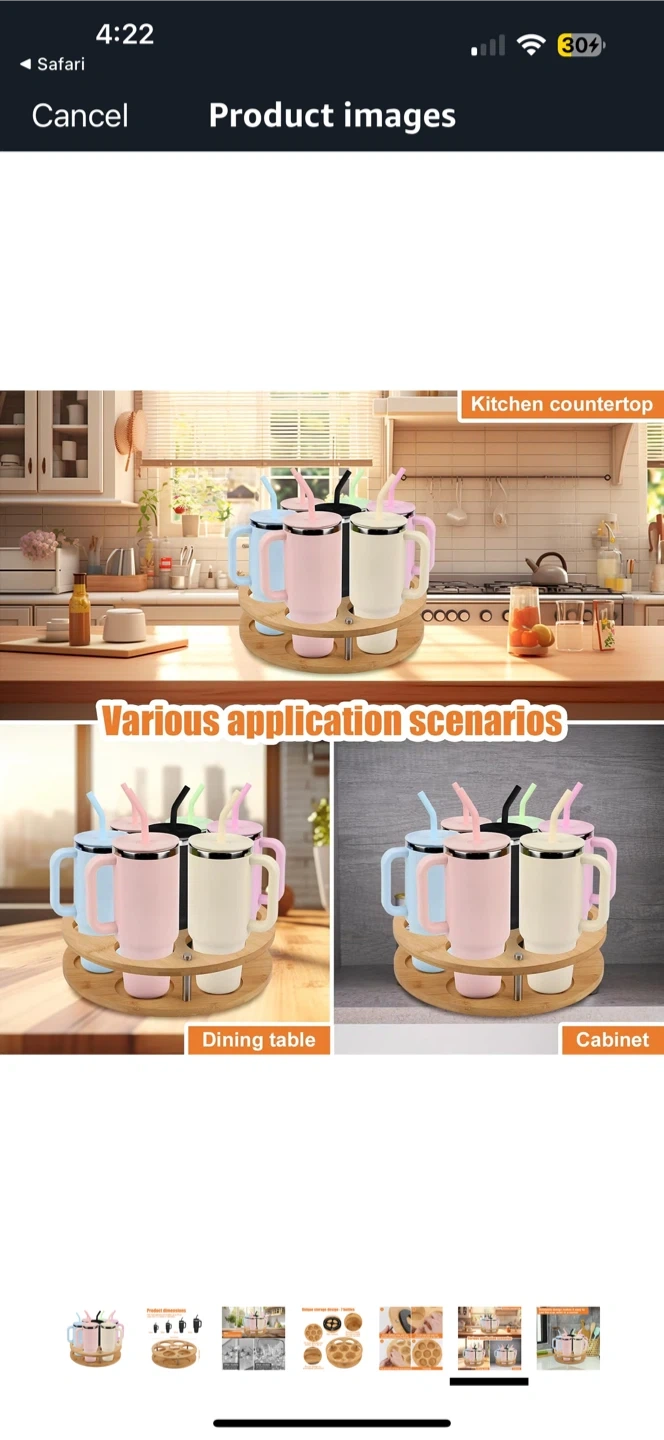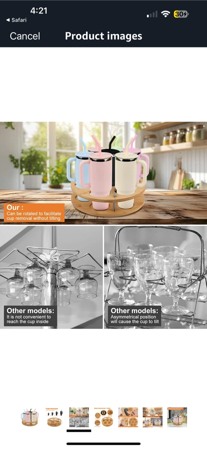 This rotating bamboo cup holder stand is perfect for organizing your cups and bottles! It can hold up to 7 bottles or glasses. It fits most glasses and bottles up to 40 oz (less than 3.3 inches in diameter). It features premium wood with an environmentally friendly varnish. The design allows for 360° rotation for easy access