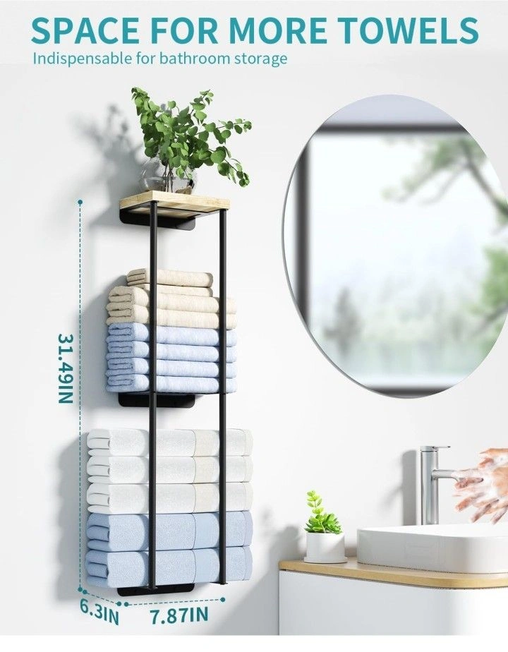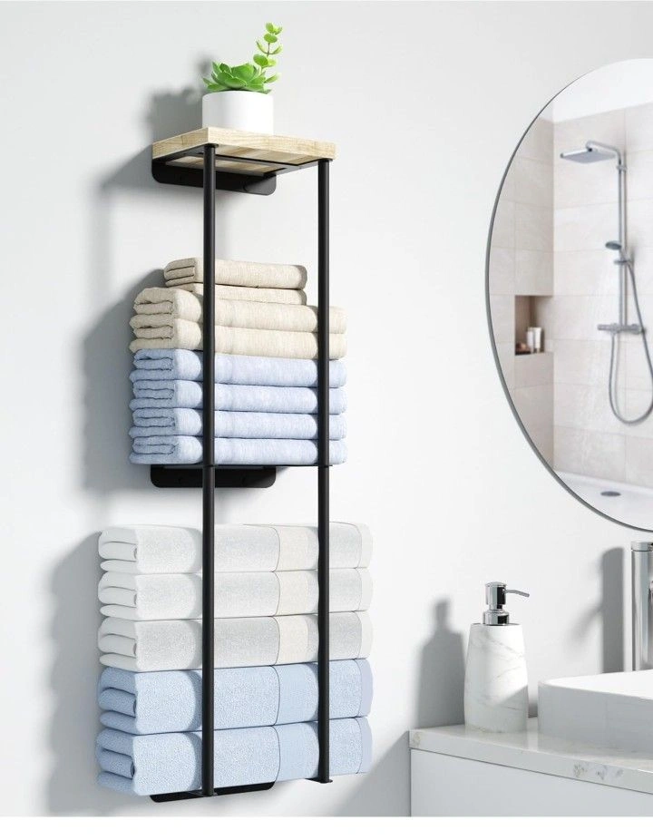 Towel Racks for Bathroom, 2 Tier Wall Towel Holder with Wood Shelf, Metal Wall Mounted Towel Rack Bathroom Organizers and Storage, Black