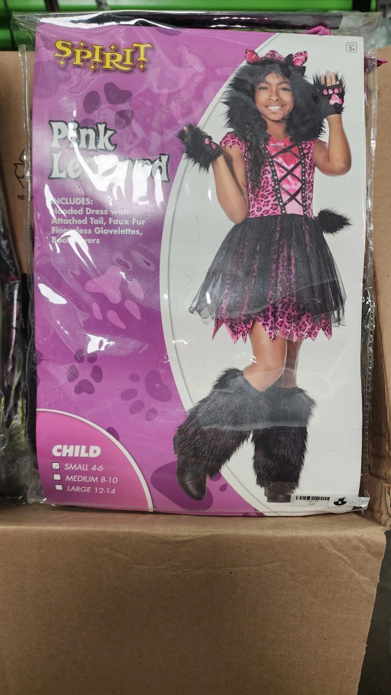 Get ready for Halloween with this adorable Spirit Halloween Pink Leopard costume! It's a child's size small (4-6) and includes a hooded dress with an attached tail, faux fur, and fingerless glovelettes