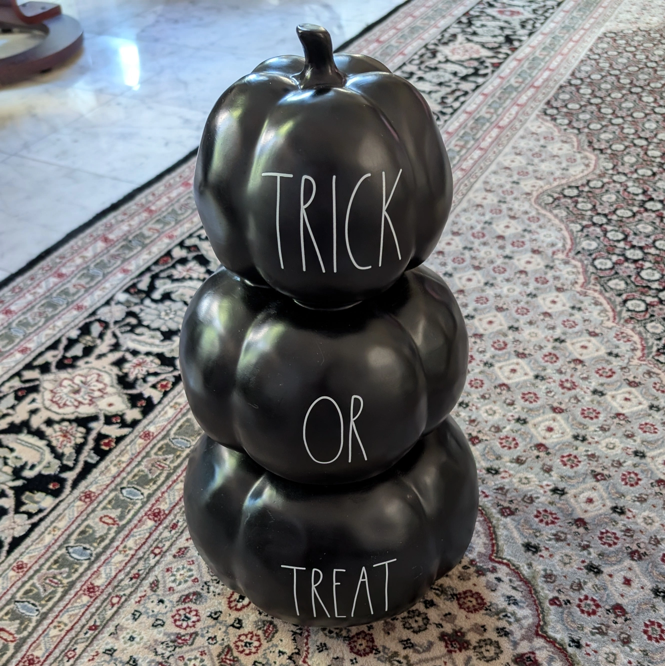 Cute Rae Dunn Artisan Collection stacked pumpkins for Halloween decor! It says "Trick or Treat" in Rae Dunn's signature font. Perfect for adding a touch of spooky charm to your home.