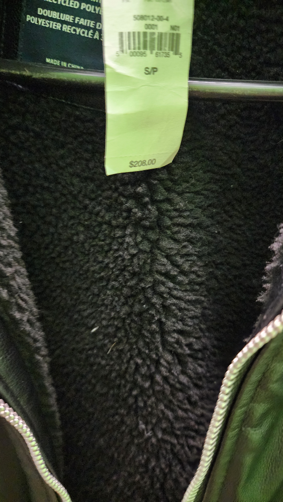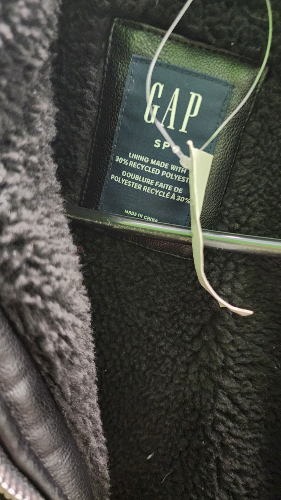 Cozy up in this stylish GAP black faux leather jacket! It features a soft sherpa lining and a sleek design. The jacket is size SP. The lining is made with 30% recycled polyester.