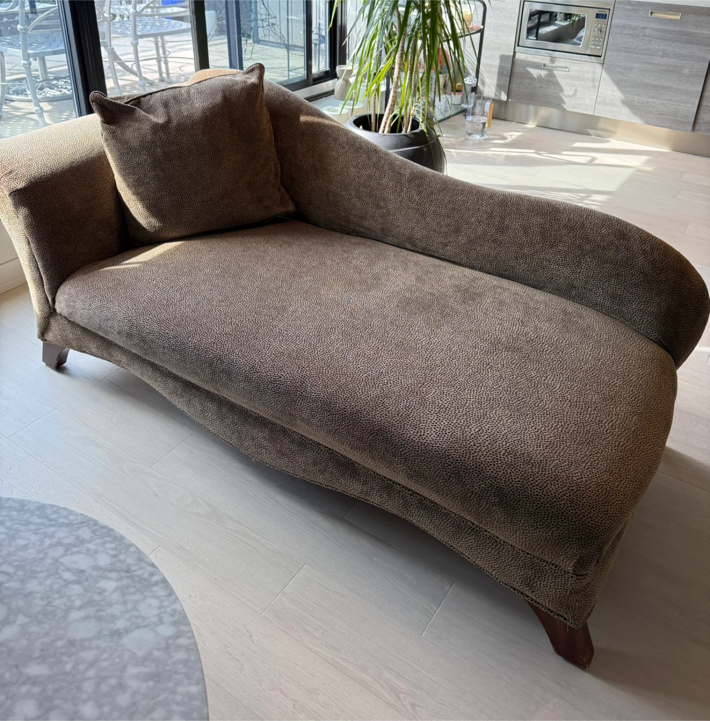 Super comfortable chaise lounge in a lovely colour! It comes with a matching pillow for extra coziness. Perfect for relaxing and adding a touch of elegance to any room.