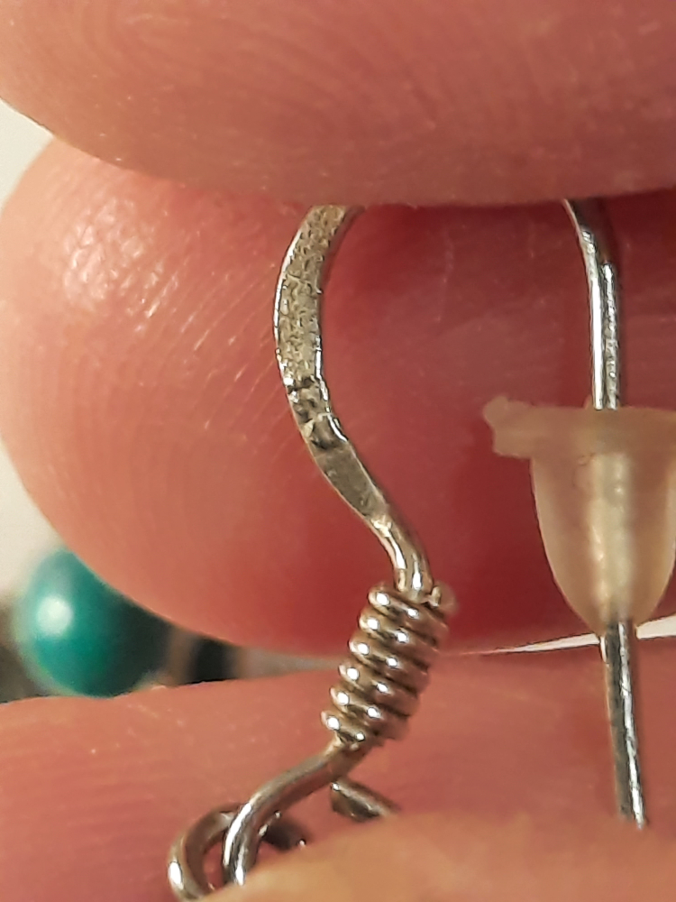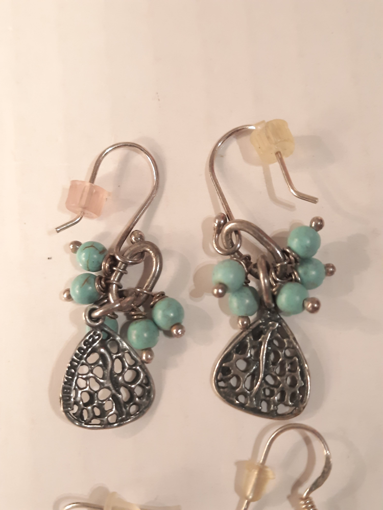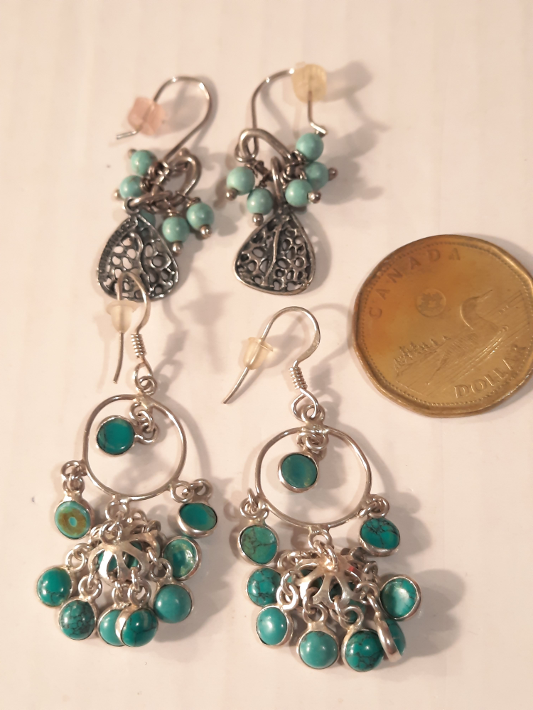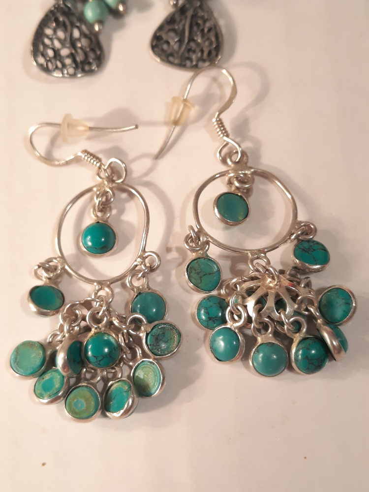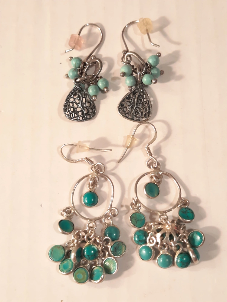 These are a lovely pair of vintage earrings. They are made of sterling silver with turquoise stones. One pair has a filigree design, and the other has a circular design with dangling stones. They are marked '925'.
