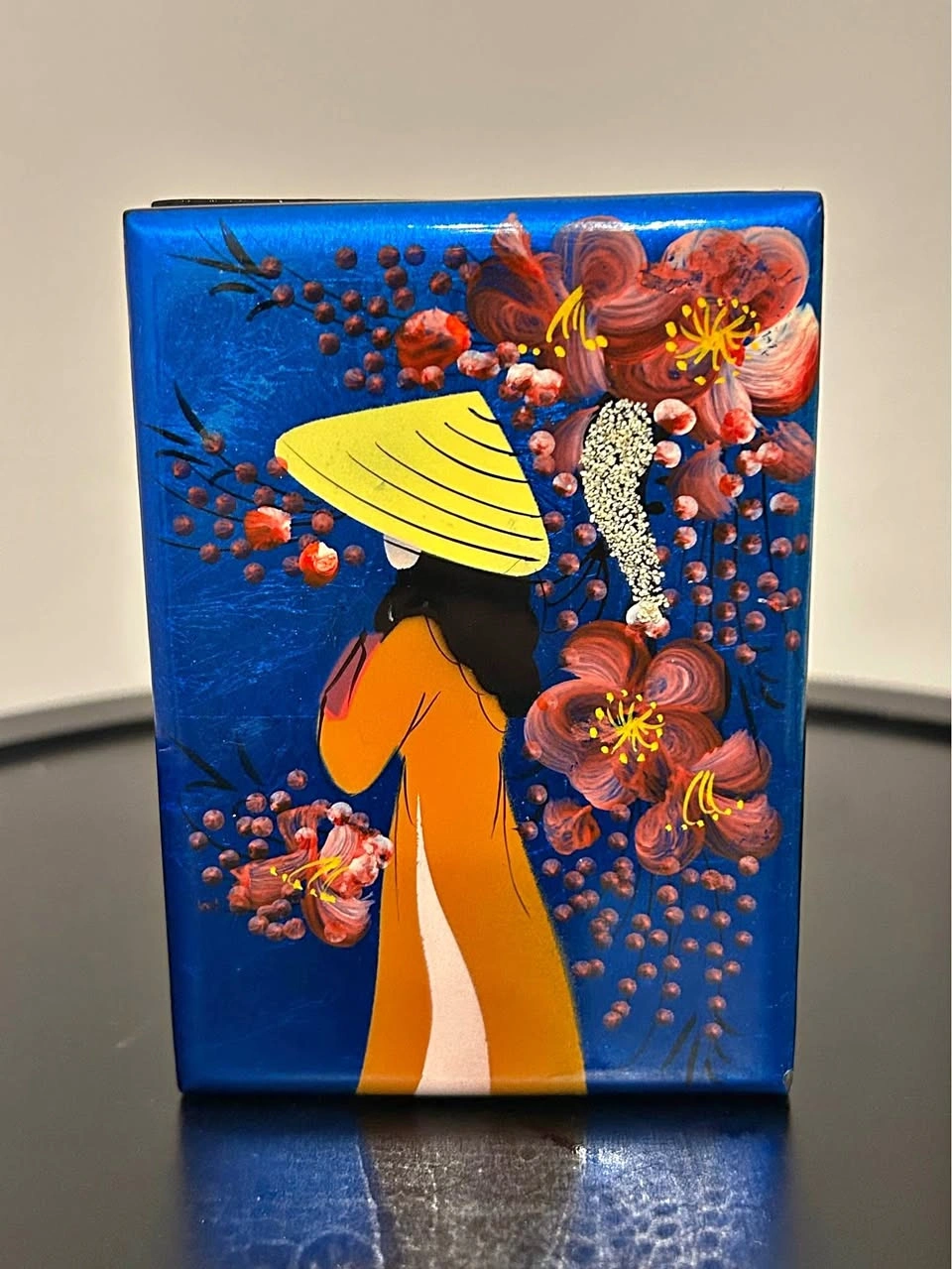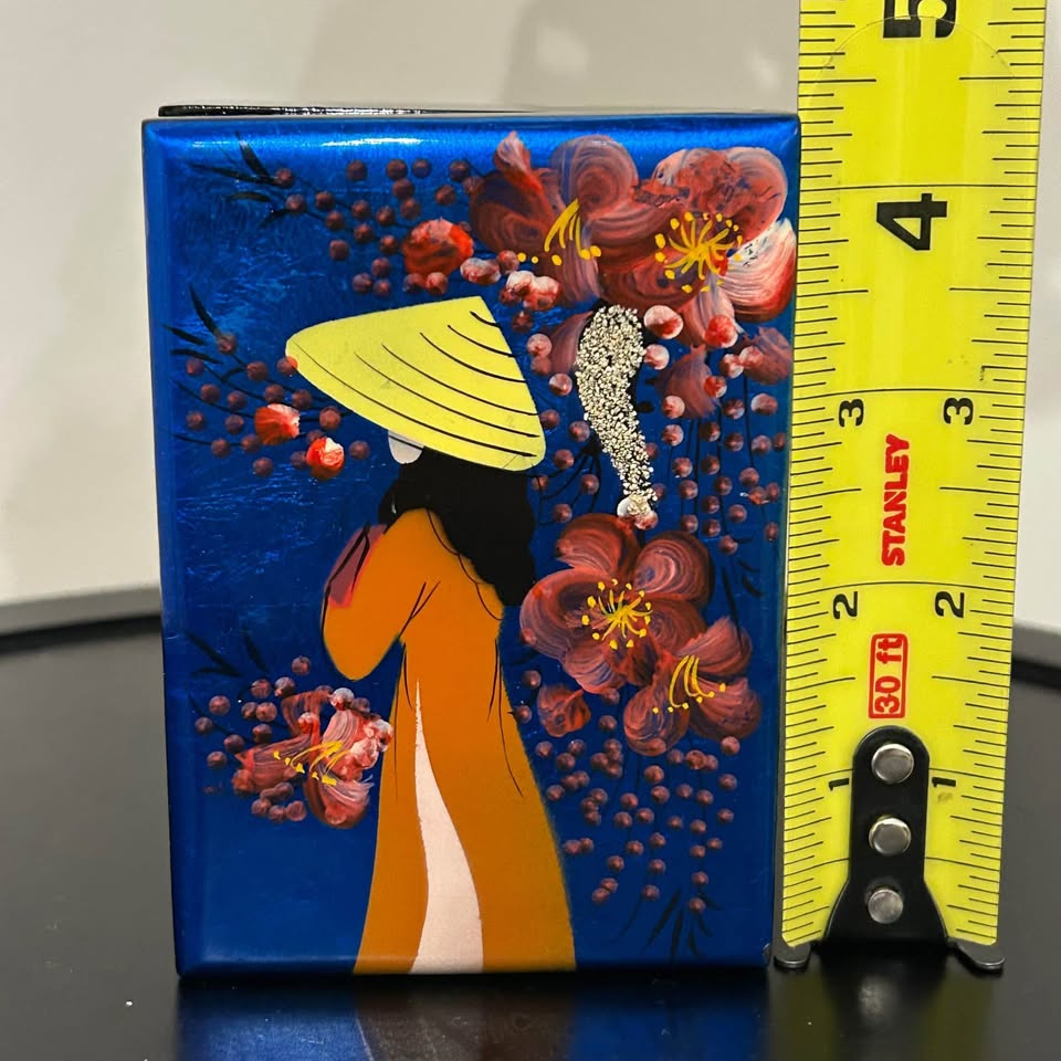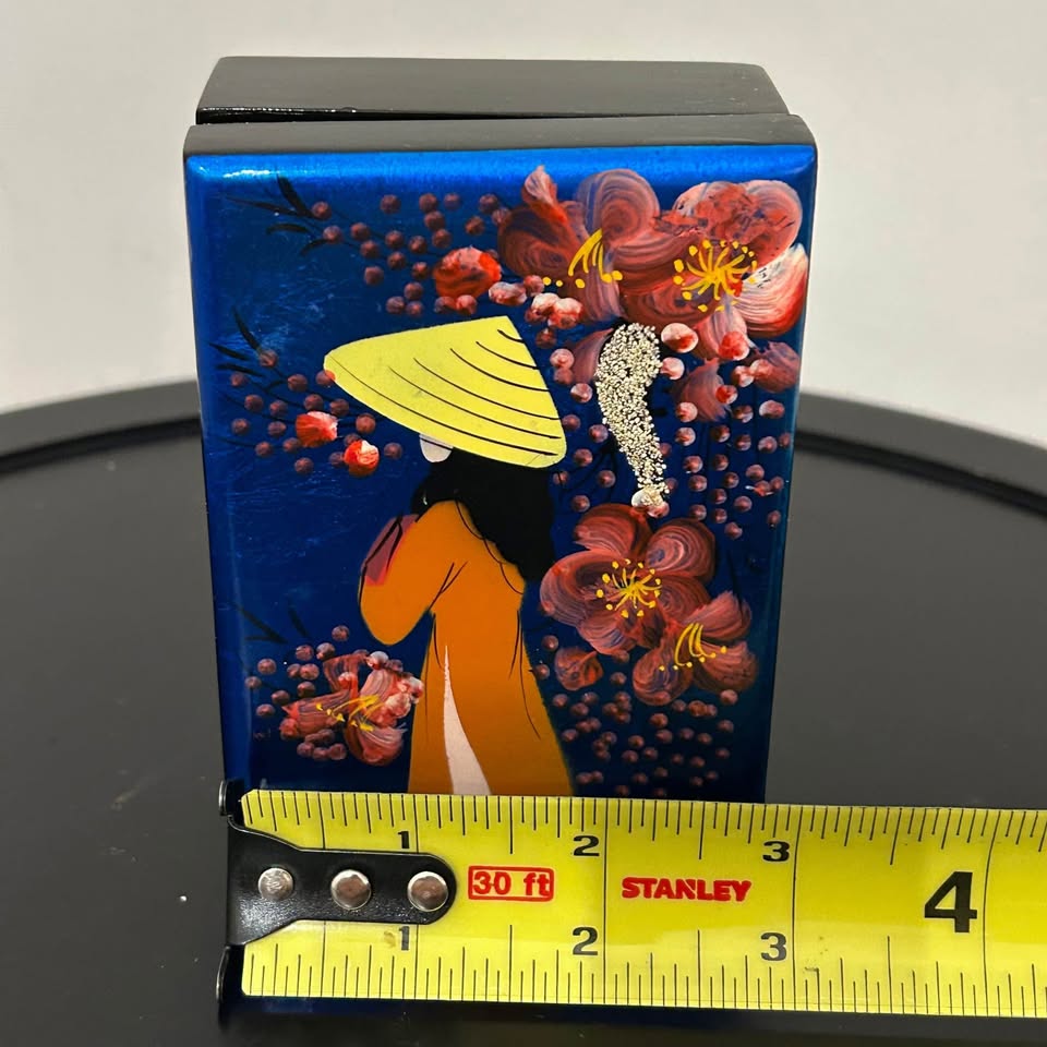 Beautiful hand-painted lacquer jewelry box from Vietnam, featuring a woman in traditional áo dài and nón lá hat surrounded by red flowers on a deep blue background. Interior lined in red velvet with a mirror under the lid. Elegant and decorative — ideal for small jewelry or as a gift box.