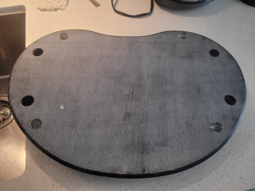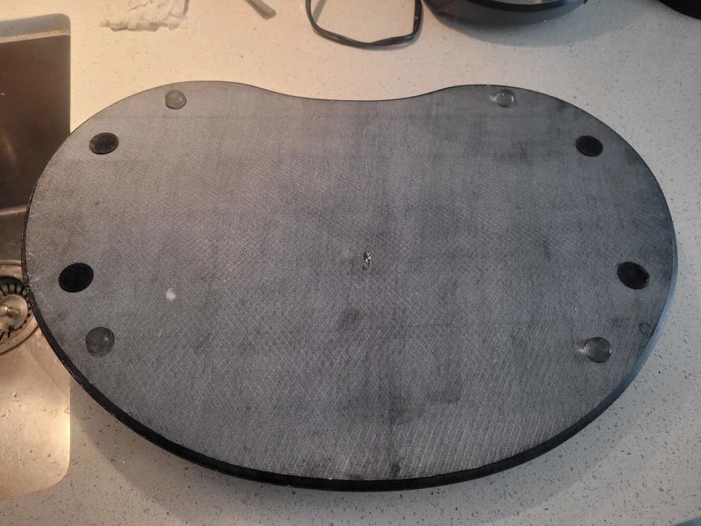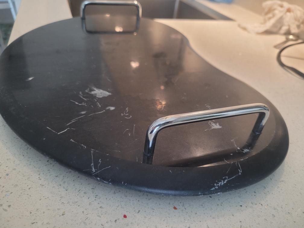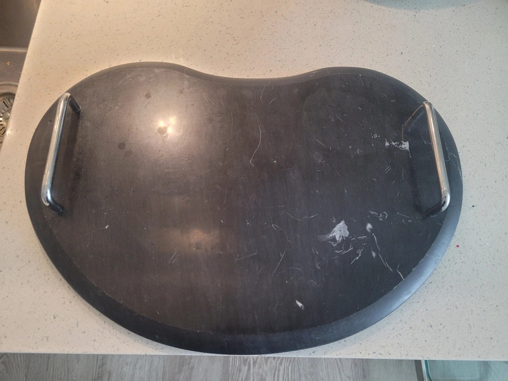 Selling a black ottoman tray with silver handles. It's in good condition with some visible scratches. The tray has a unique bean shape and four small feet on the bottom to prevent sliding. Perfect for serving snacks or drinks on your ottoman!
