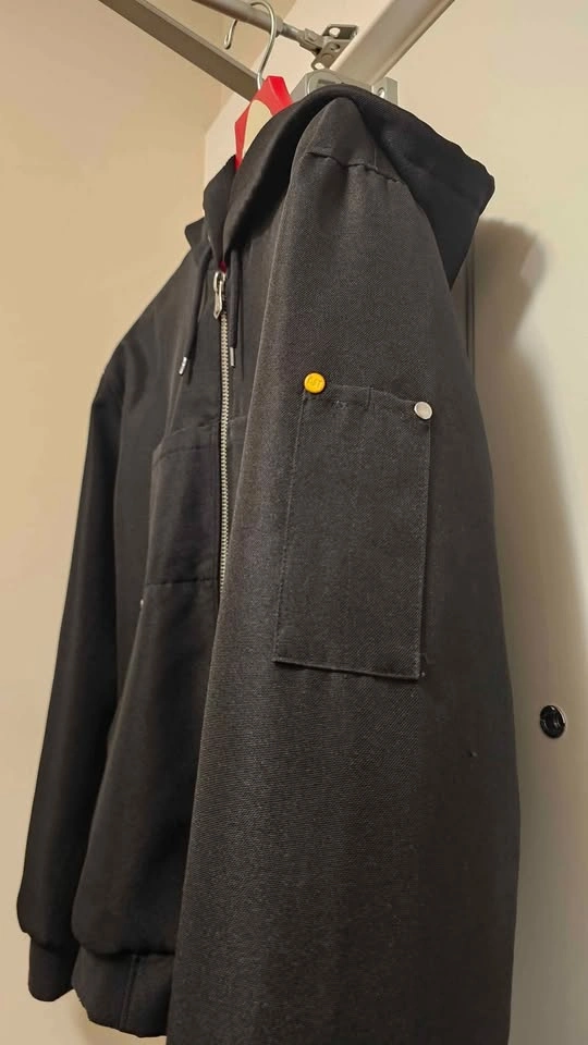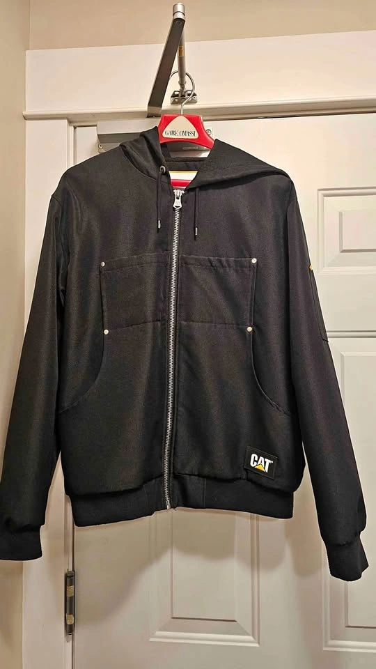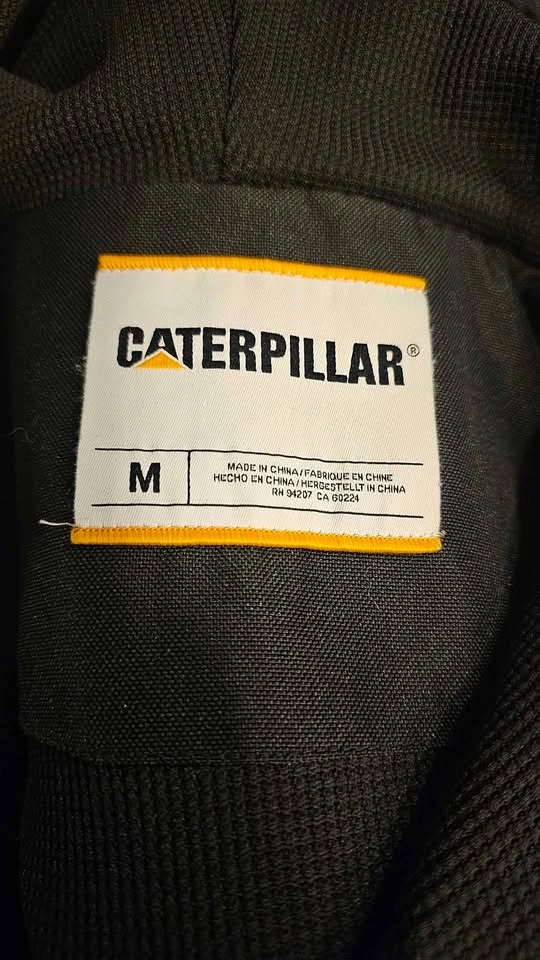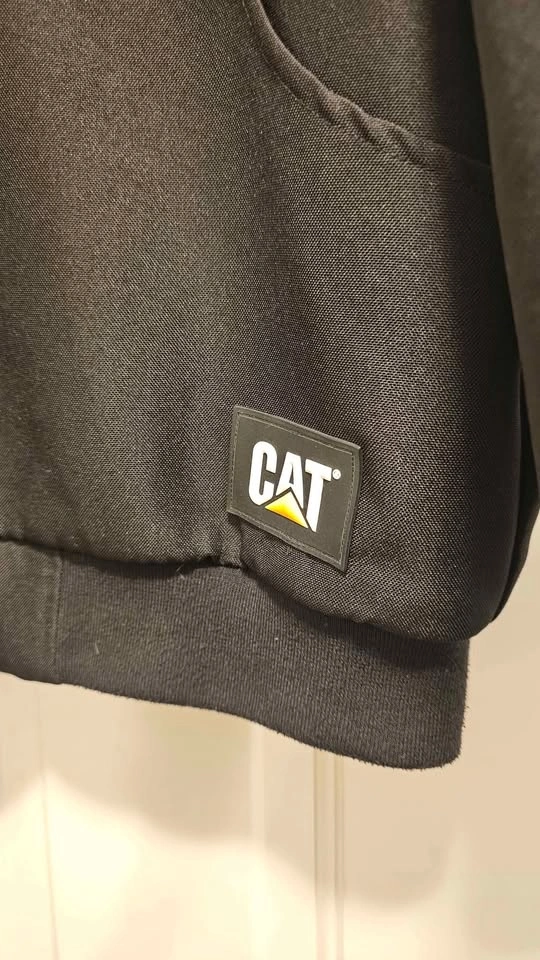 Lightly worn. Caterpillar CAT work jacket, men’s size medium. Black hooded, full zip. Durable outdoor workwear. Brand: Caterpillar (CAT) Size: Medium (Men’s) Material: • Shell: 100% Polyester • Lining: 97% Polyester, 3% Spandex Closure: Heavy-duty full front zipper Features: • Durable, weather-resistant fabric for work and outdoor environments • Adjustable hood with drawstrings for added protection • Large front pockets with reinforced rivet details • Ribbed cuffs and hem for a secure fit • Interior pocket for additional storage--black thermal lining • Official CAT® logo patch on lower hem Pick up in Maple Ridge or Langley.