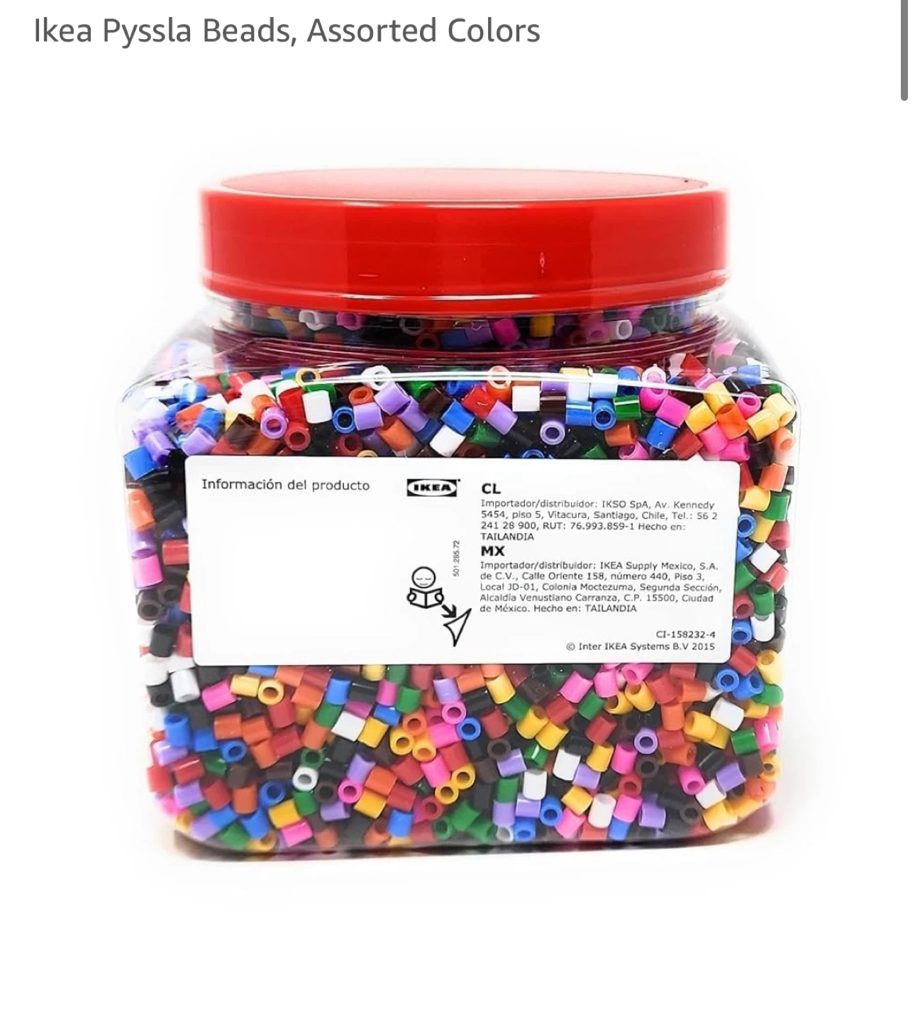 I'm selling a jar of Ikea Pyssla beads in assorted colours. These are great for kids' crafts and other projects! Suitable for children aged 4 and up. Warning: choking hazard, small parts