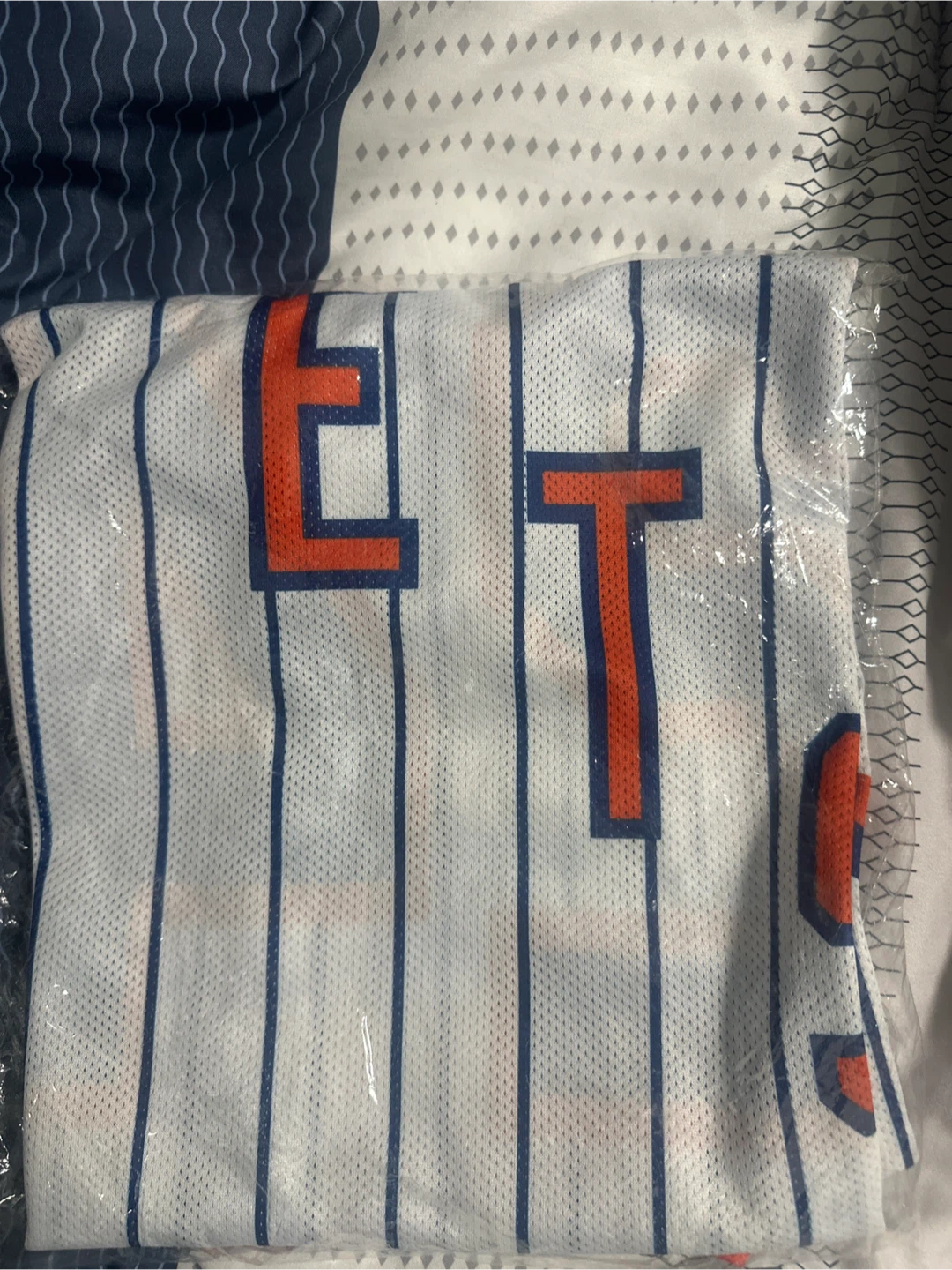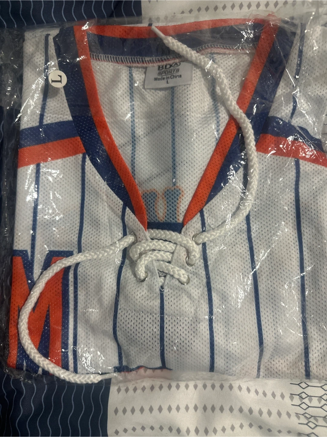 I have a brand new mets jersey, still in its original packaging! It's a size L and features a classic design. Perfect for any baseball fan or player looking for a fresh jersey