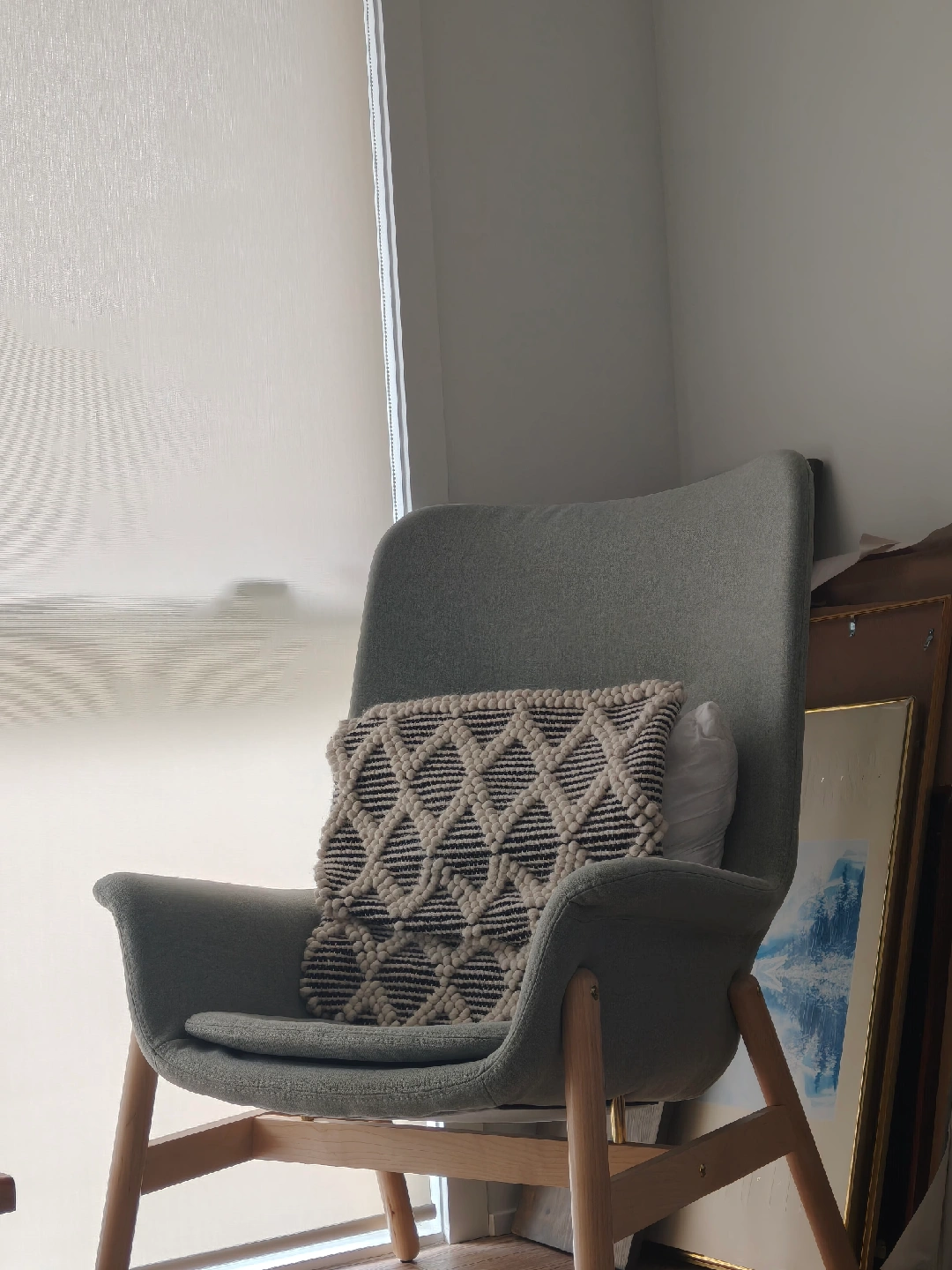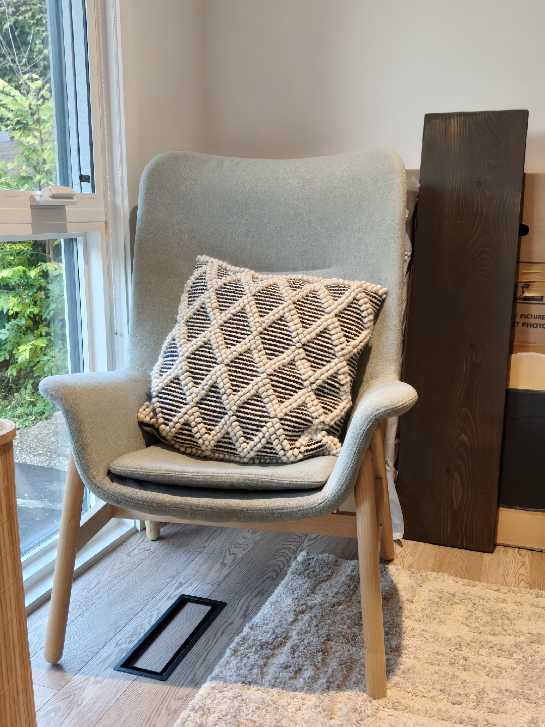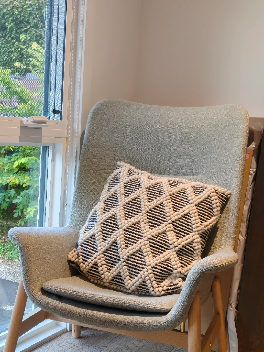 Selling a modern armchair in great condition! It is a comfy cushion. Perfect for adding a touch of style to any room. Throw pillow is not included.