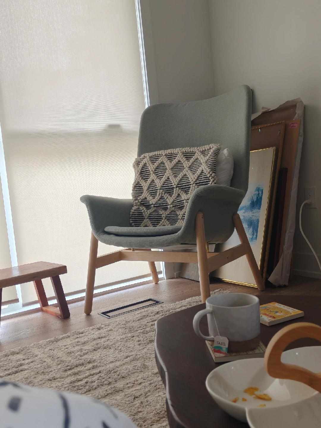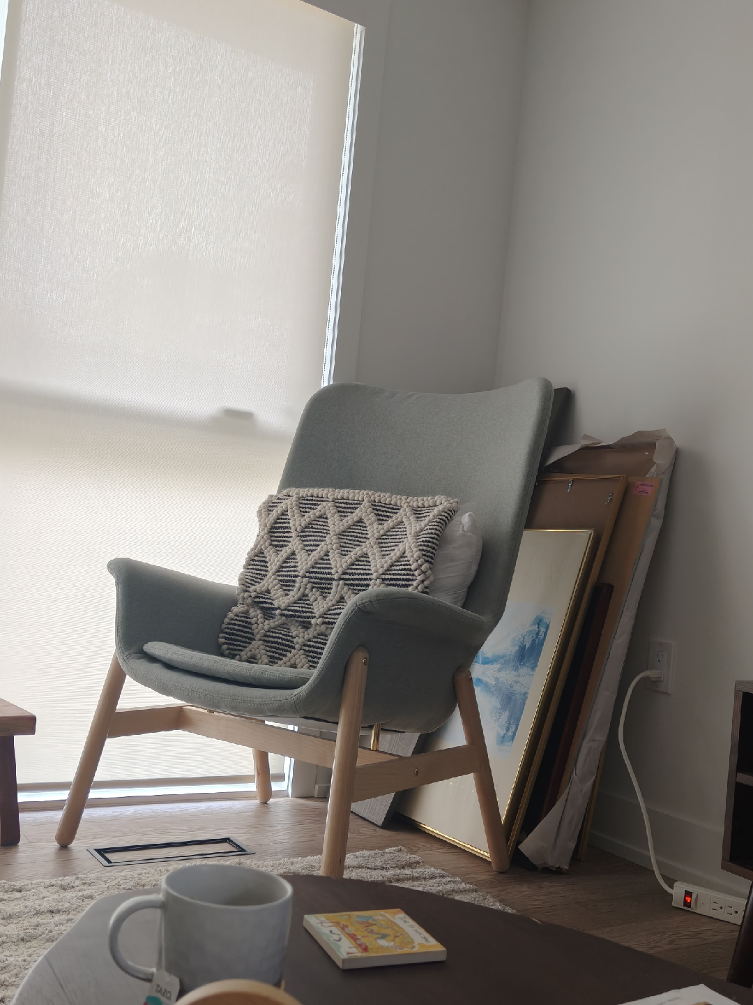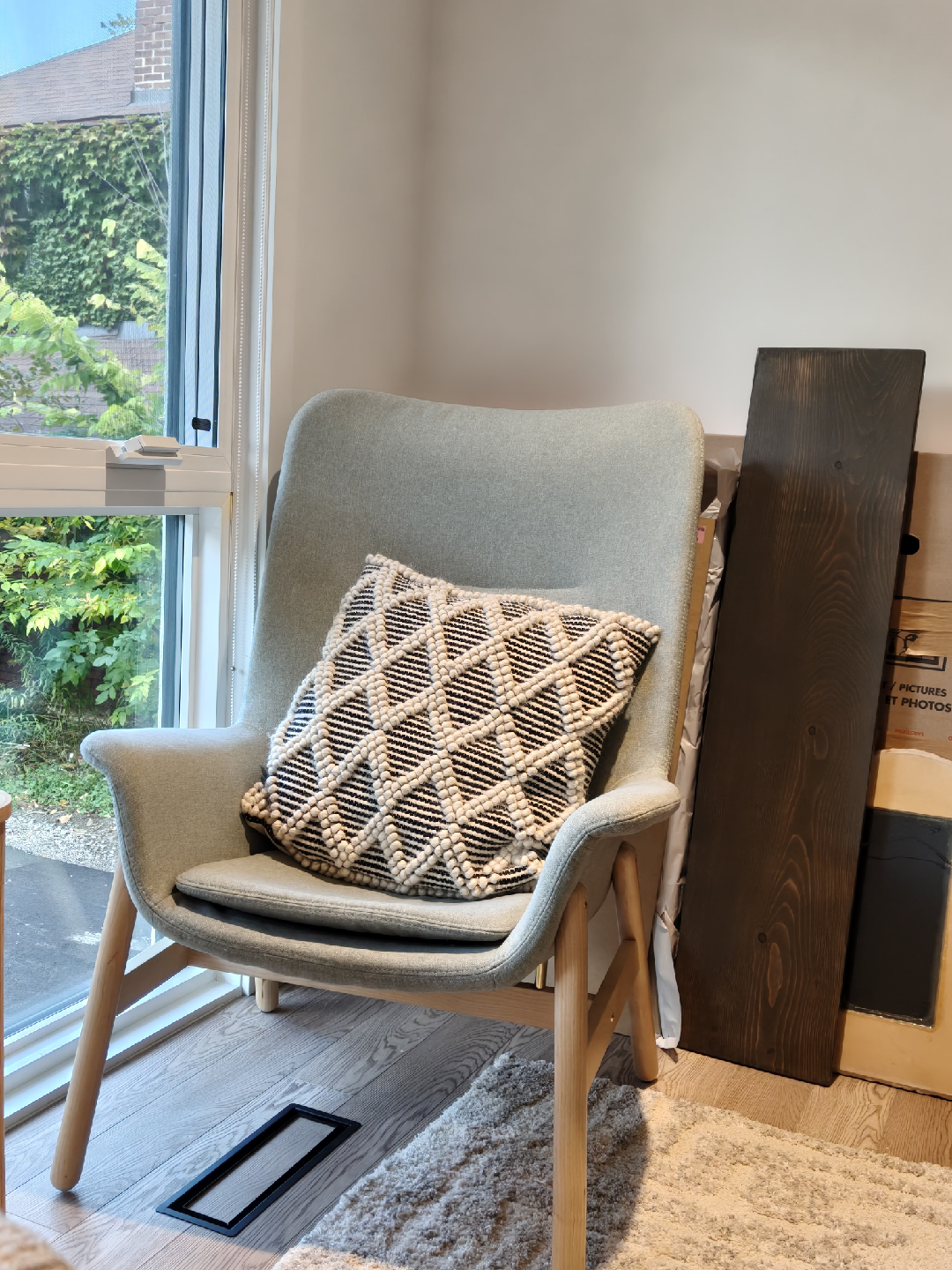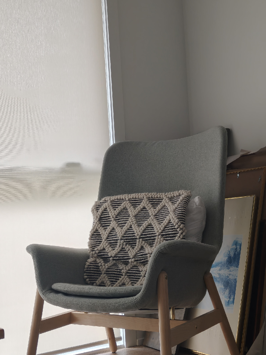 Selling a modern armchair in great condition! It is a comfy cushion. Perfect for adding a touch of style to any room. Throw pillow is not included.