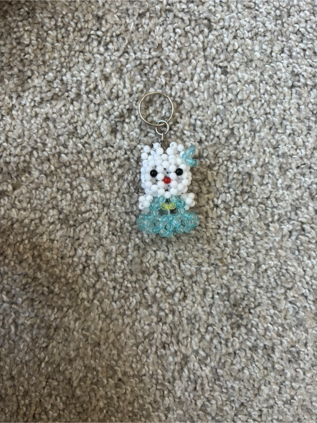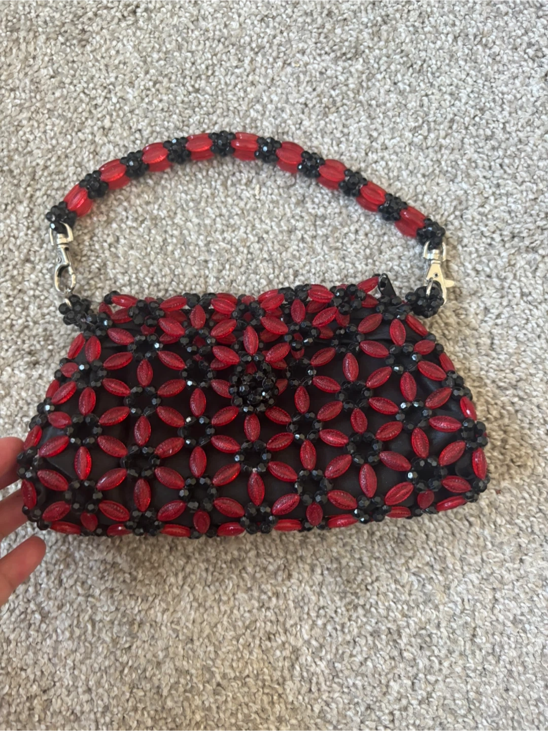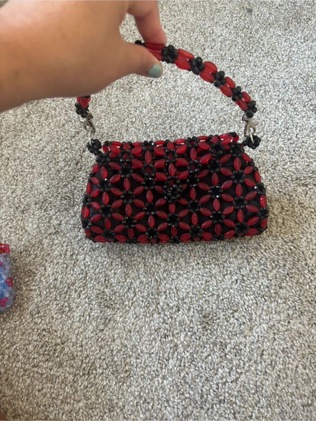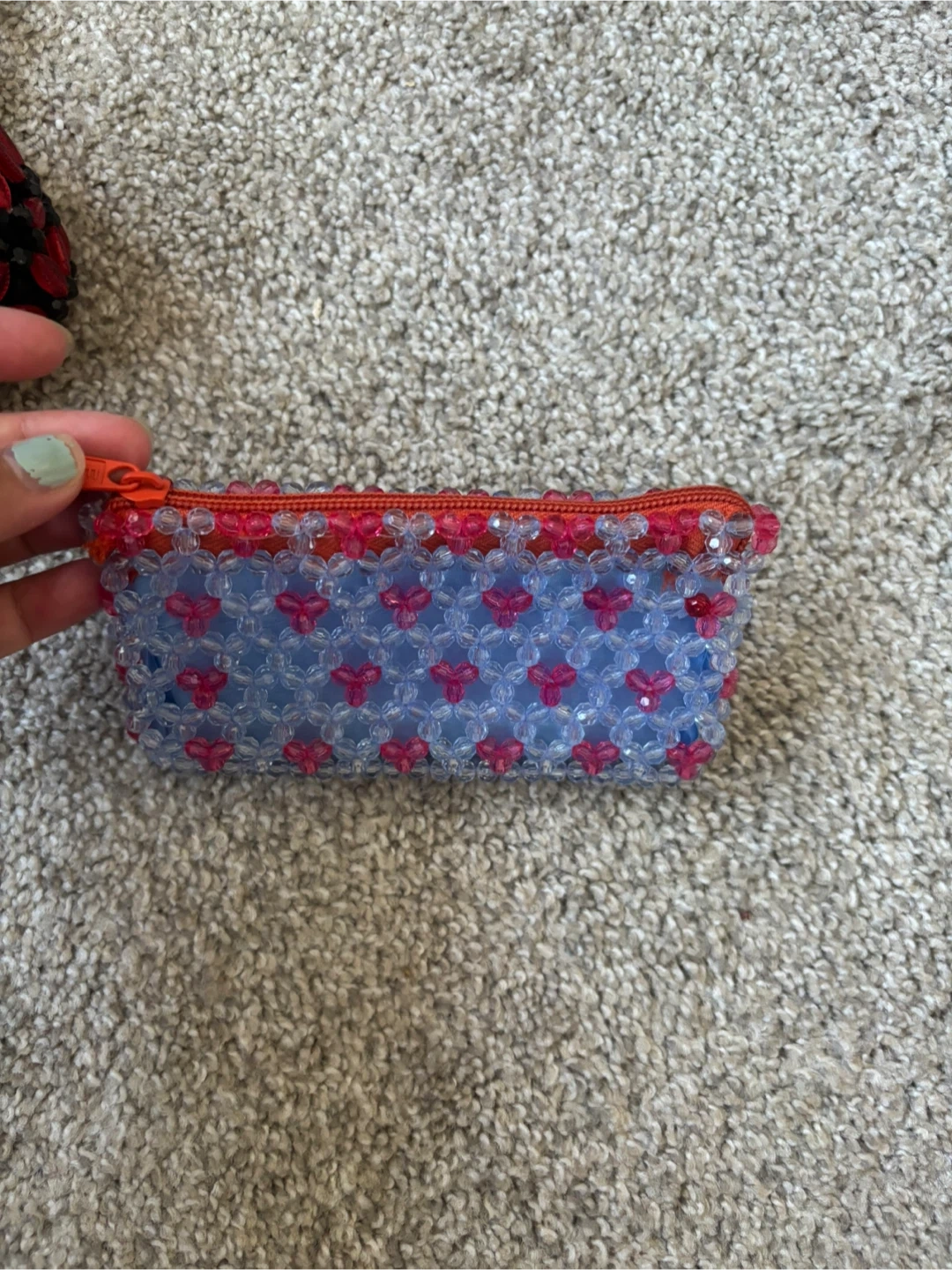 Selling a handmade beaded purse, a small beaded coin purse and beaded keychain. The purse is black and red, and the coin purse is blue and pink. Both are in great condition!