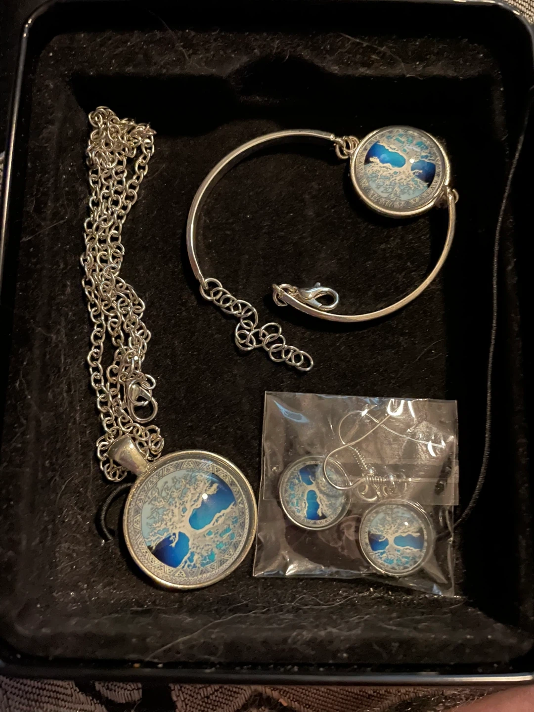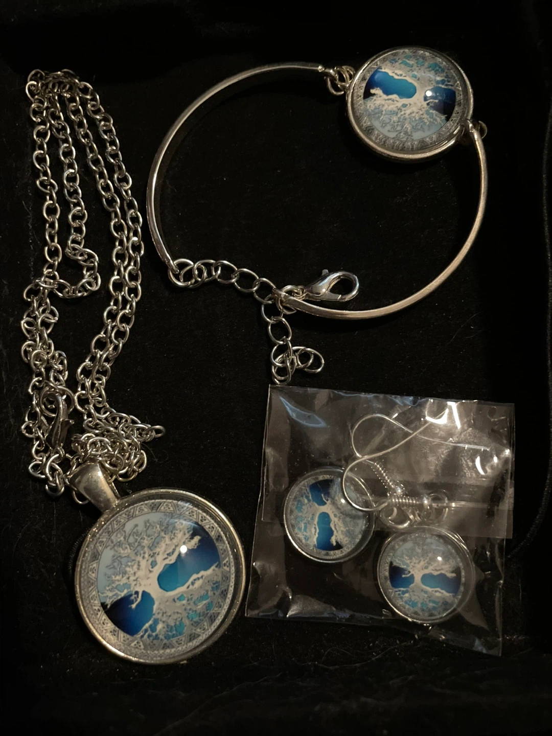 Selling a matching jewelry set! Includes a necklace, bracelet, and a pair of earrings. The set features a unique design with a blue and white tree-like pattern. Perfect for adding a touch of elegance to any outfit!