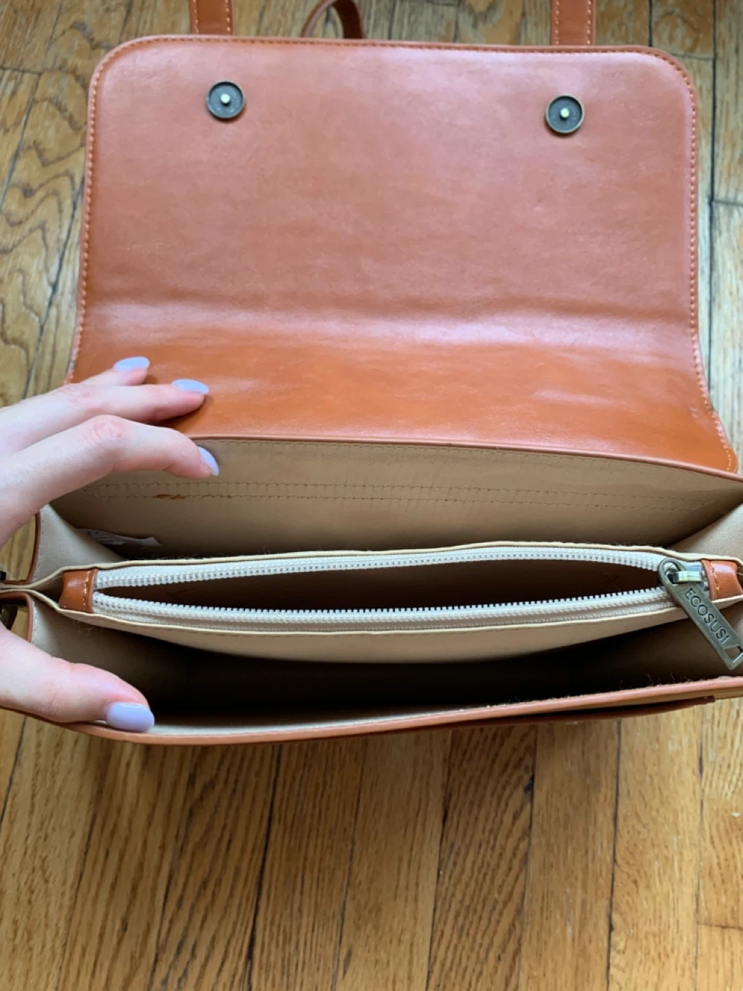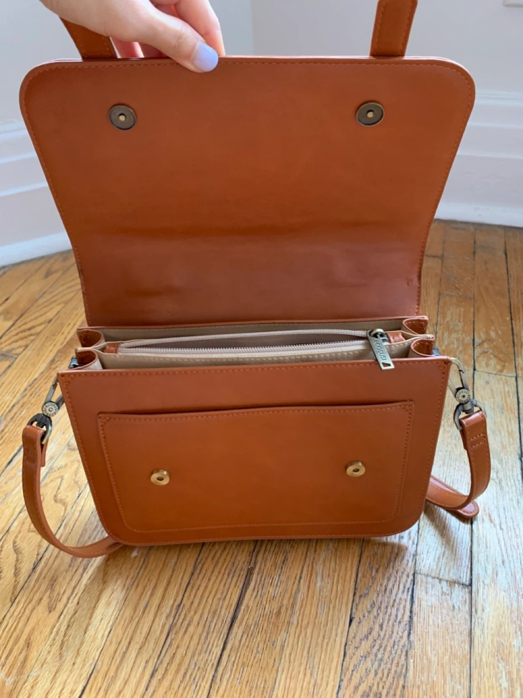 139Selling a cute satchel bag in a vintage brown colour! It's in great condition and versatile. It can be worn in both a shoulder bag or a handbag. Perfect for carrying your essentials in style! 💼 Adjustable & detachable strap 💼 Multiple storage compartments 💼 100% vegan leather 💼 Polyester lining