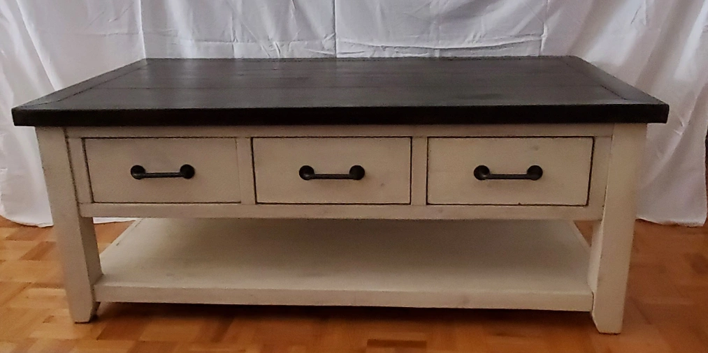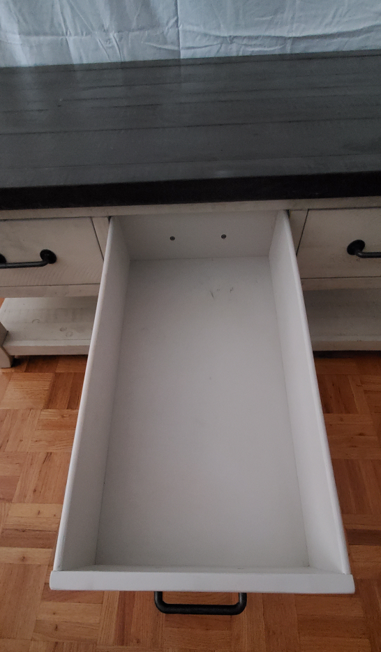 Three drawers, pull out on either side. Very light and easy to move around, yet sturdy.