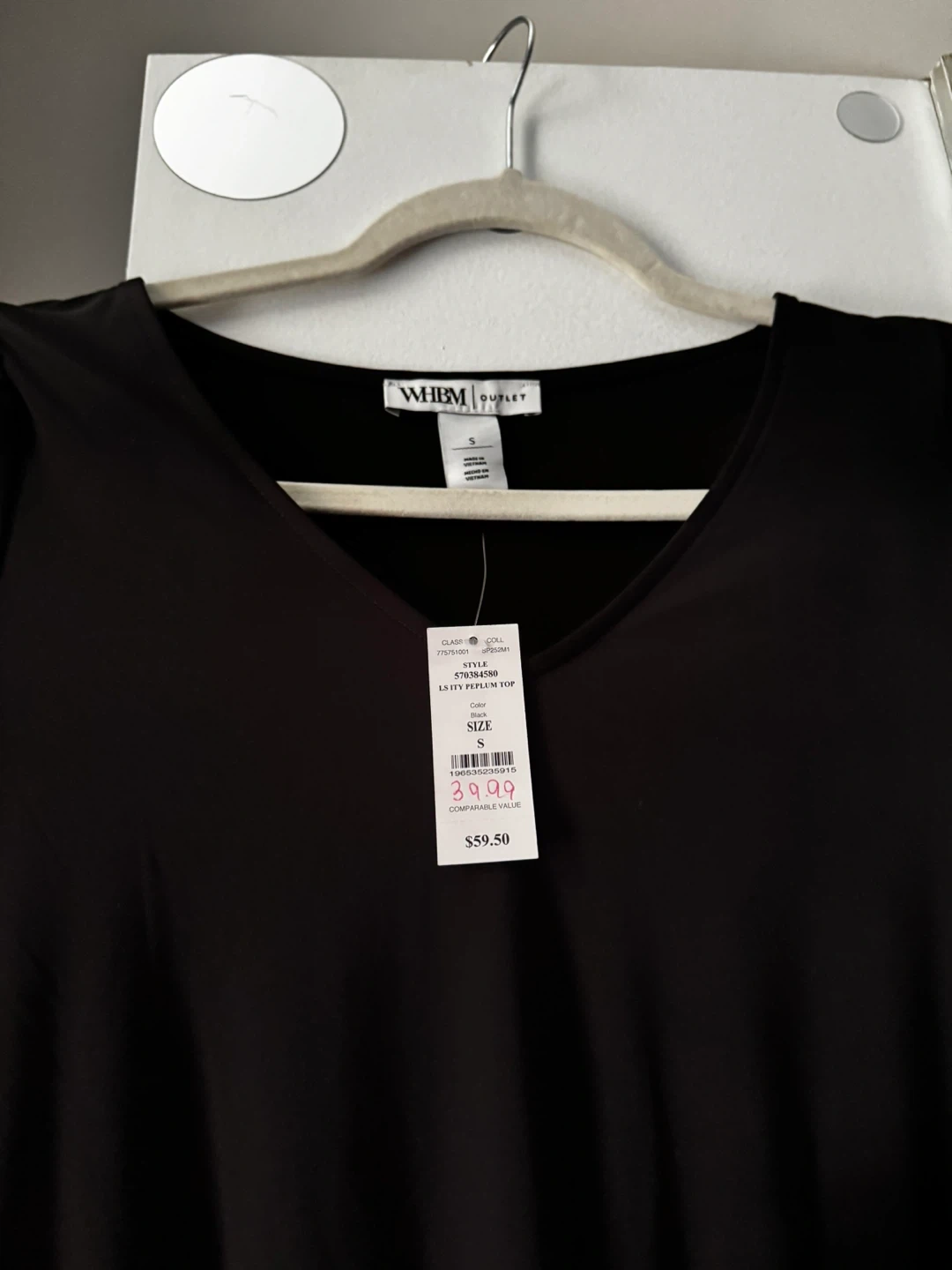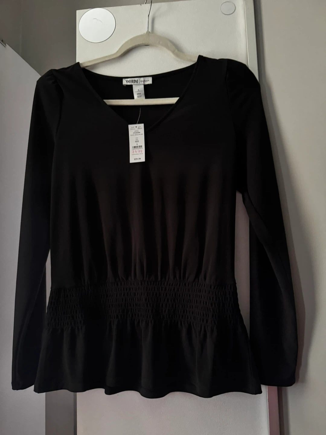 This is a WHBM (White House Black Market) black long sleeve V-neck peplum top in size small. It is in new condition with tags still attached! Originally priced at $59.50.