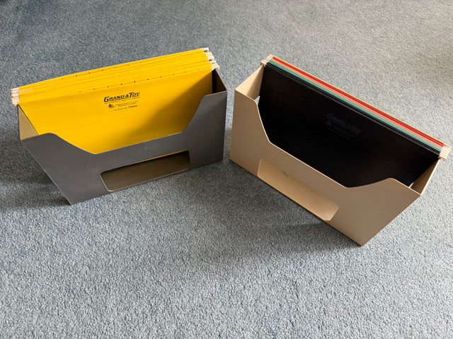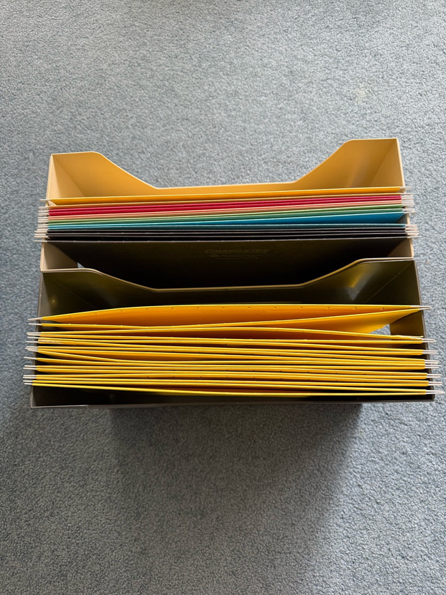 Legal size hanging folders with racks. 25 hanging folders in total with two racks to hold hanging folders. Must take both sets. Asking $20 obo. Evening or weekend pick up only. Closest major intersection is Hurontario Street and Central Parkway in Mississauga.
