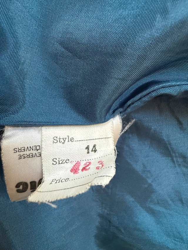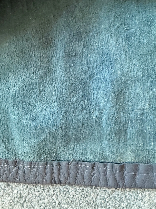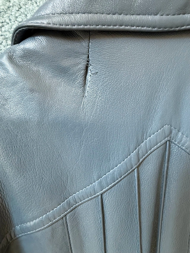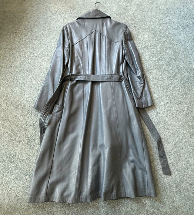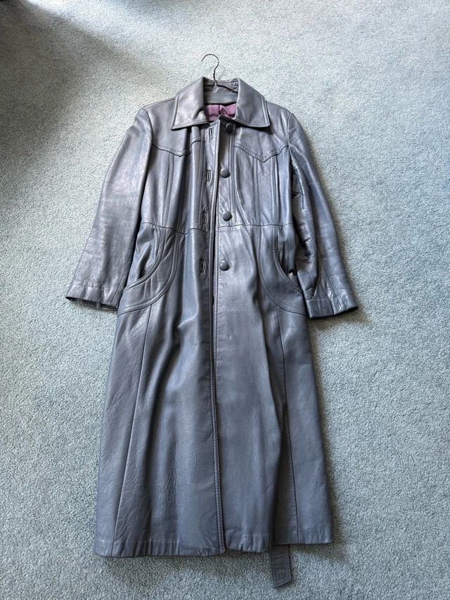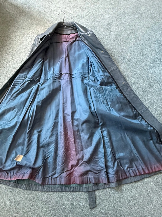 Vintage 100% genuine leather long trench coat, with belt. Blue/blueish grey colour - very good vintage condition. Minor imperfections: - Stitching needs attention near upper back (see photo). - Small mark on outside back (see photo). - Slight discolouration on interior lining from age and wear - One button needs to be sewn back on. It was my grandmother’s. It’s definitely over 40 years or more old. Closest major intersection is Hurontario Street and Central Parkway in Mississauga.