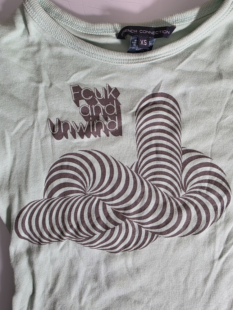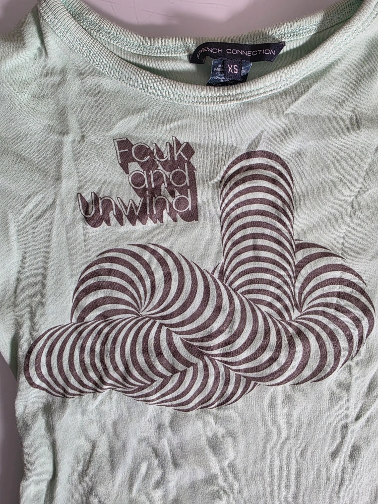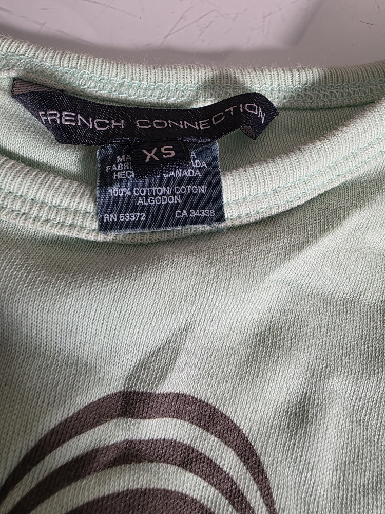 Vintage French Connection FCUK t-shirt in size XS. It's a light green colour with a unique design in good condition. 100% cotton.