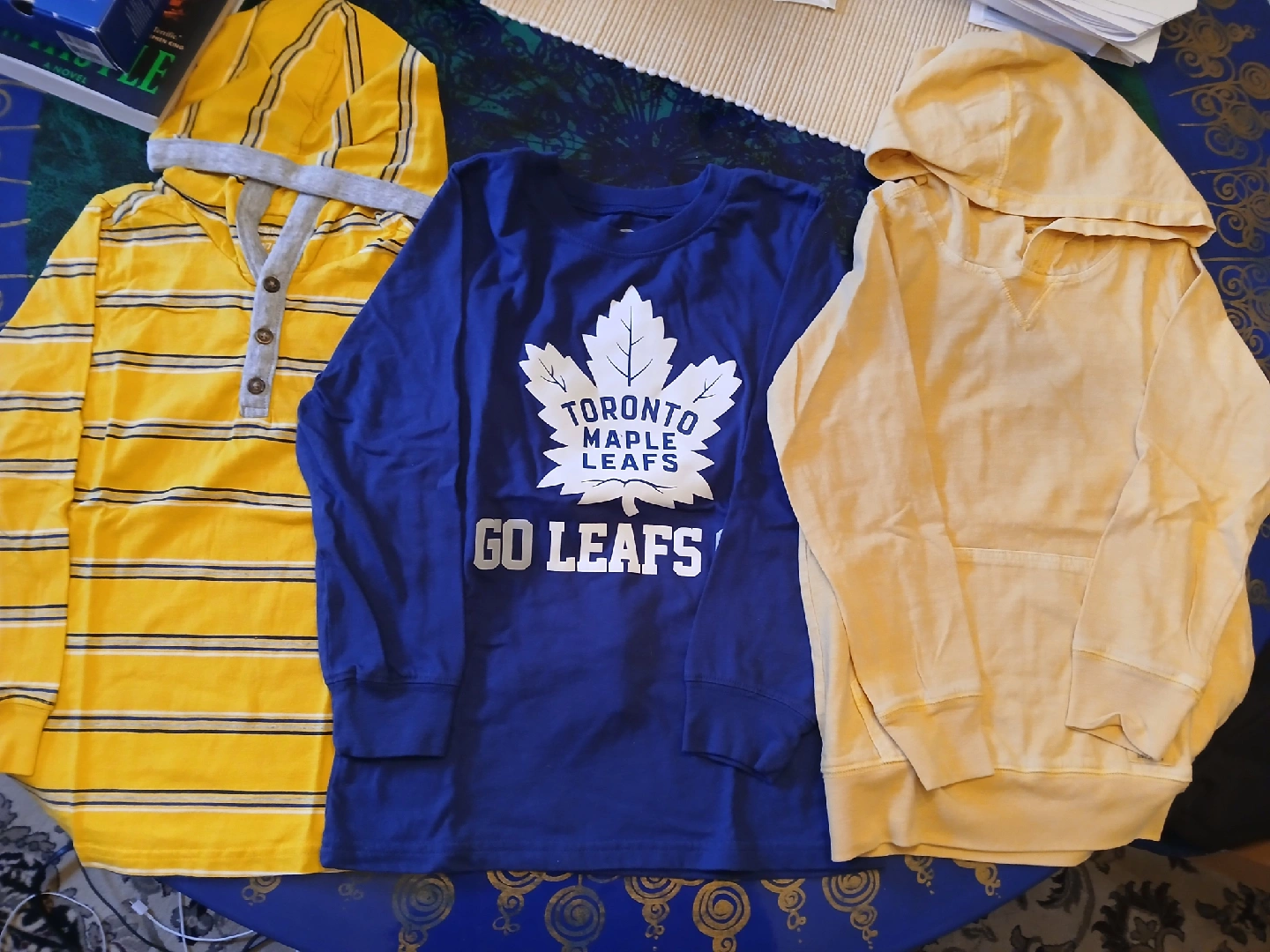 Three long-sleeved t-shirts, size 7/7A, brands Carter’s, NHL, and OshKosh (from left to right). Two yellow shirts in particular are barely worn (kiddo decided he didn’t like long-sleeved t-shirts). Price is for the lot.