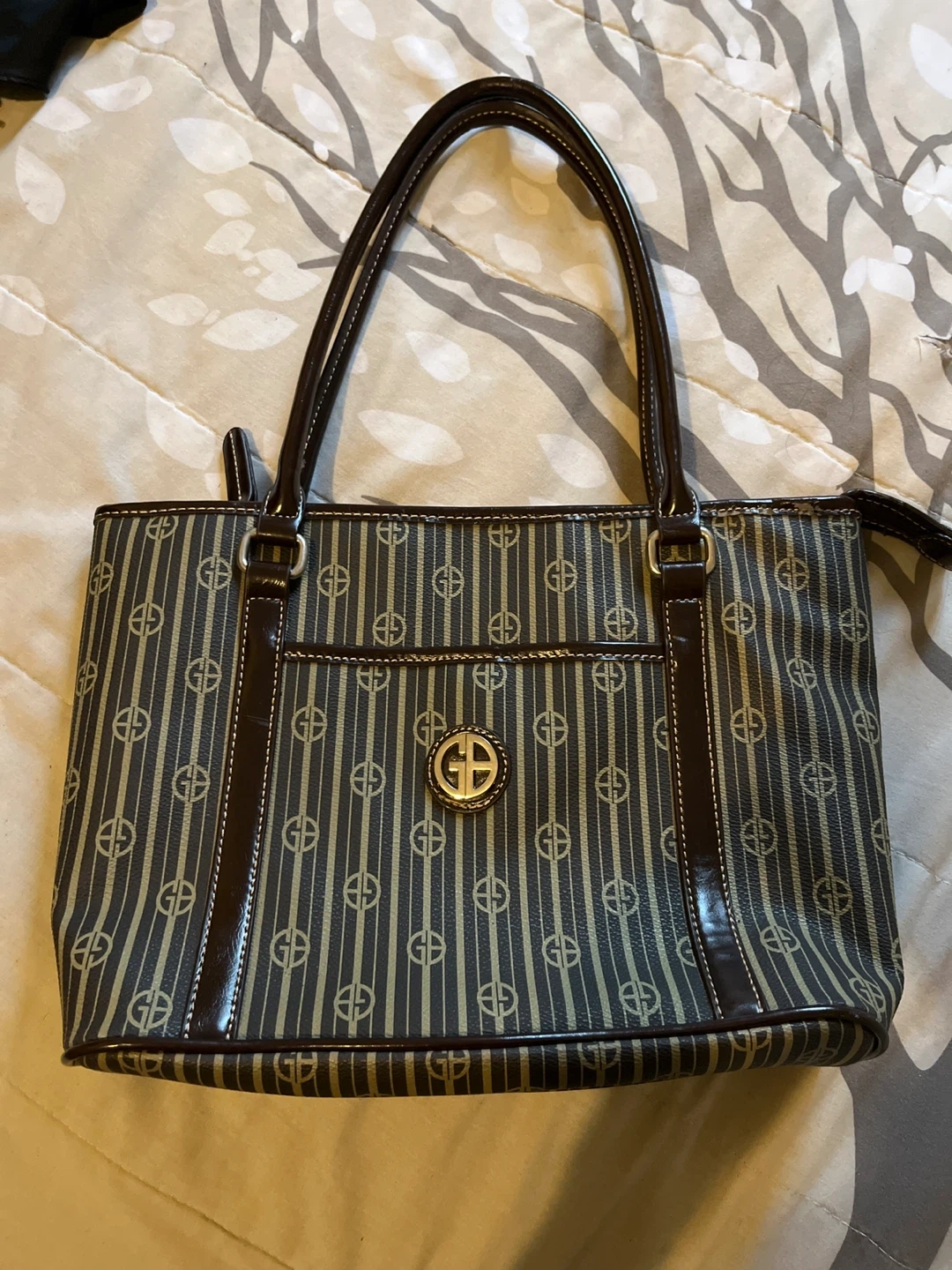 Here is a Giani Bernini tote bag. It features a striped pattern with the brand's logo. The bag has brown handles and trim. It's in great condition and ready for a new home!