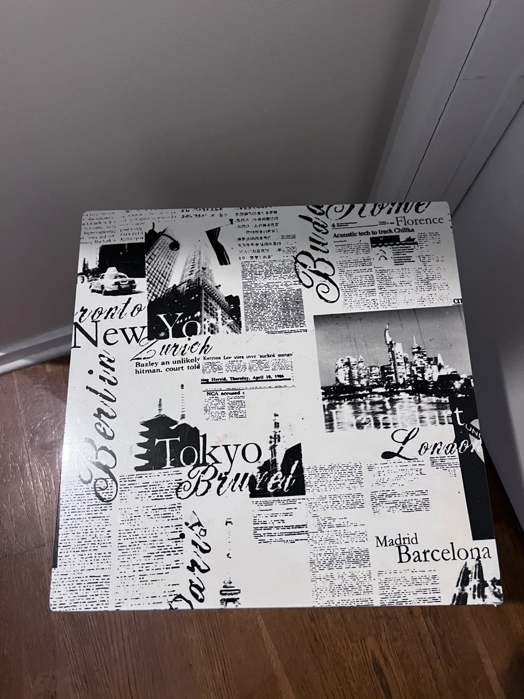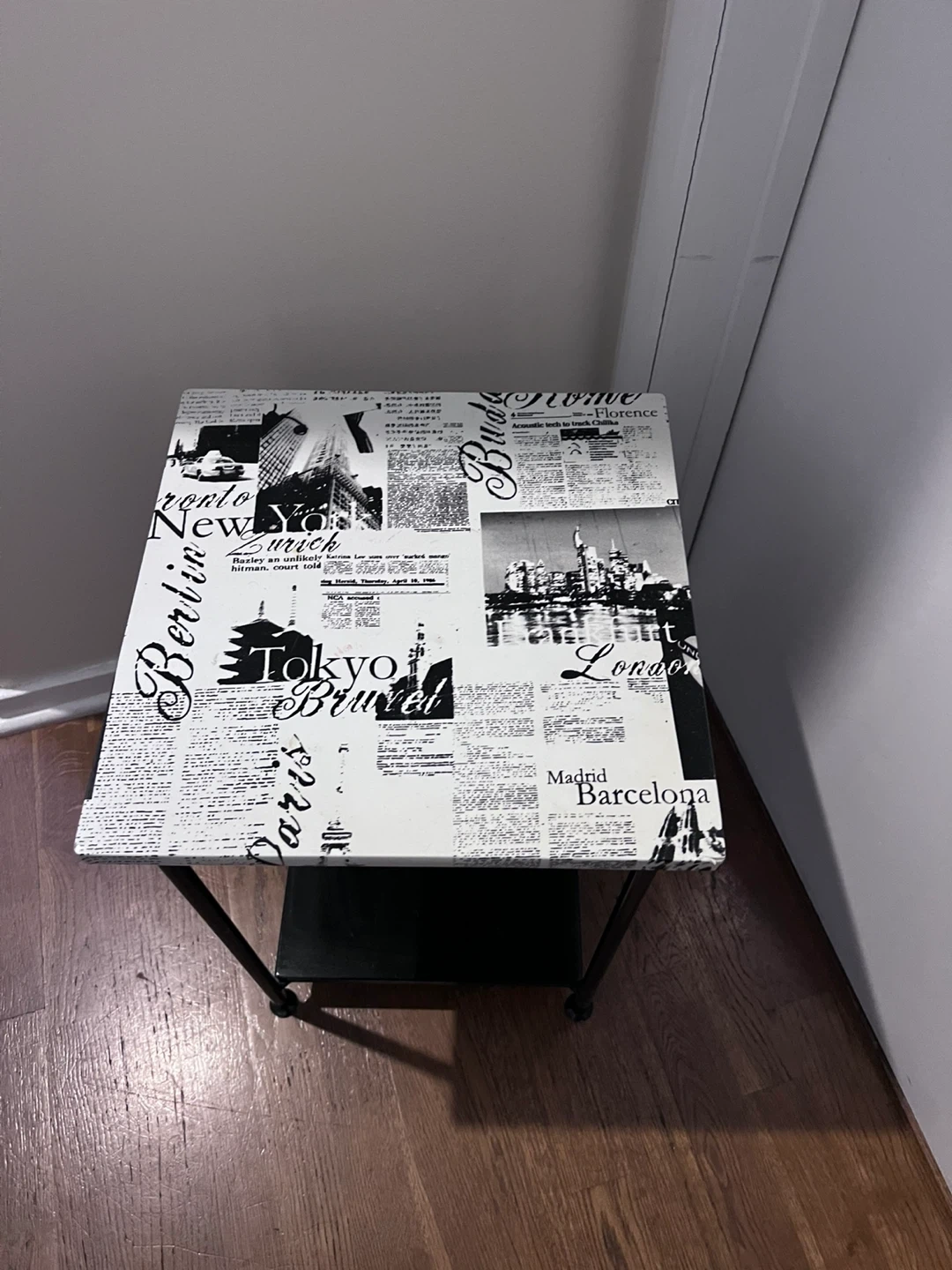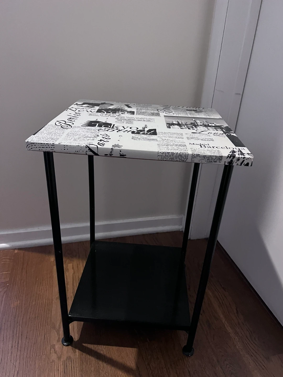 This is a cute side table with a newspaper print top and black metal legs. It has a small shelf underneath for extra storage. Perfect for a small space or as a bedside table! pick up.