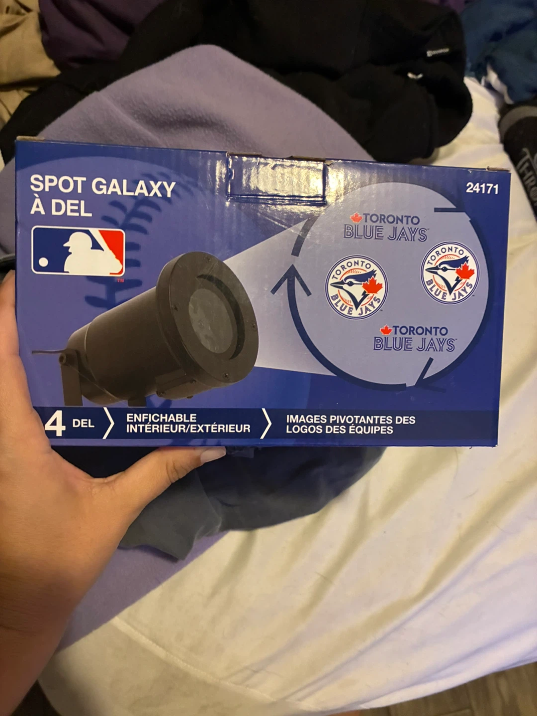 Selling a Toronto Blue Jays LED Galaxy Spotlight! It's perfect for showing your team spirit, indoors or outdoors. It projects pivoting images of the Blue Jays logo. Get ready to light up your space with Jays pride!