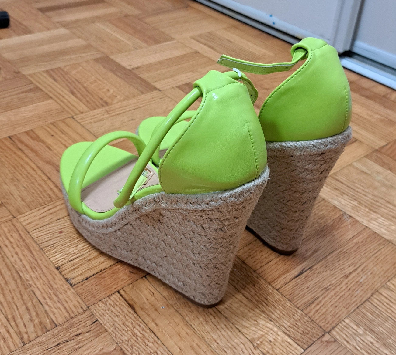 Cute lime green wedge heels from SheIn in a size 6 but it fits more like a size 8. These are perfect for adding a pop of colour to your summer outfits! They feature a comfortable wedge heel and an ankle strap for a secure fit. The platform is made of woven material, giving them a natural, summery vibe