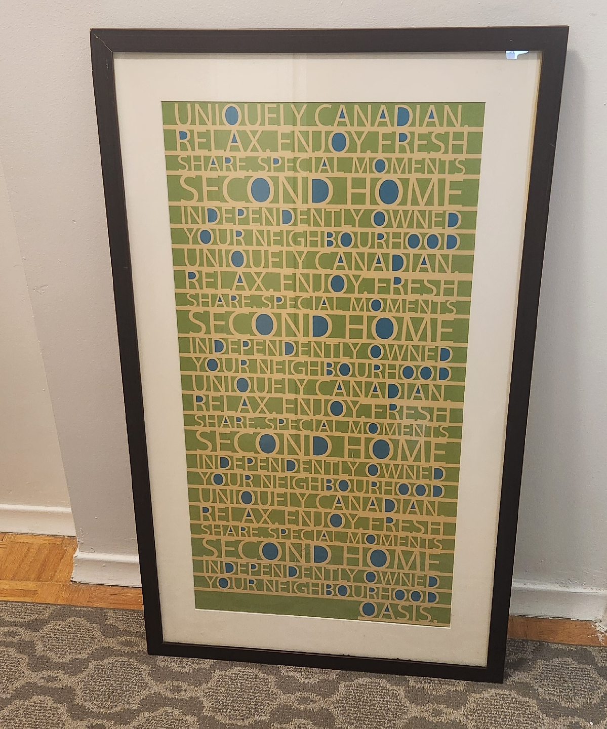 One features the words 'Uniquely Canadian' and 'Second Home'. The other is an abstract design in earth tones.