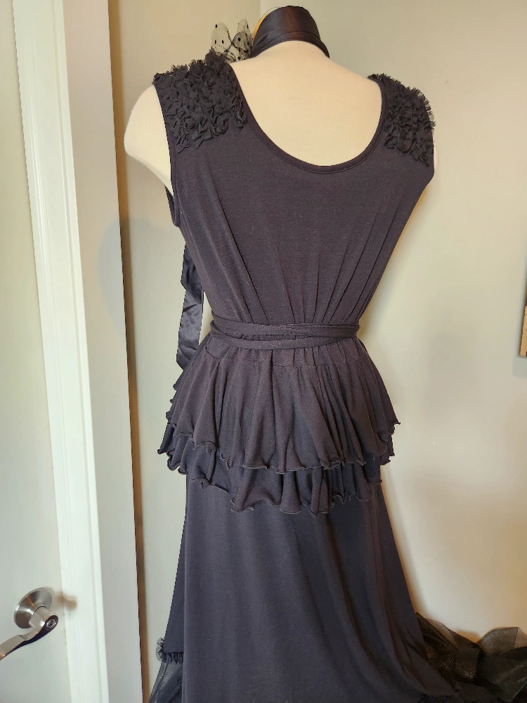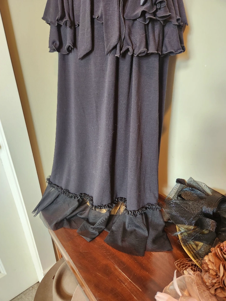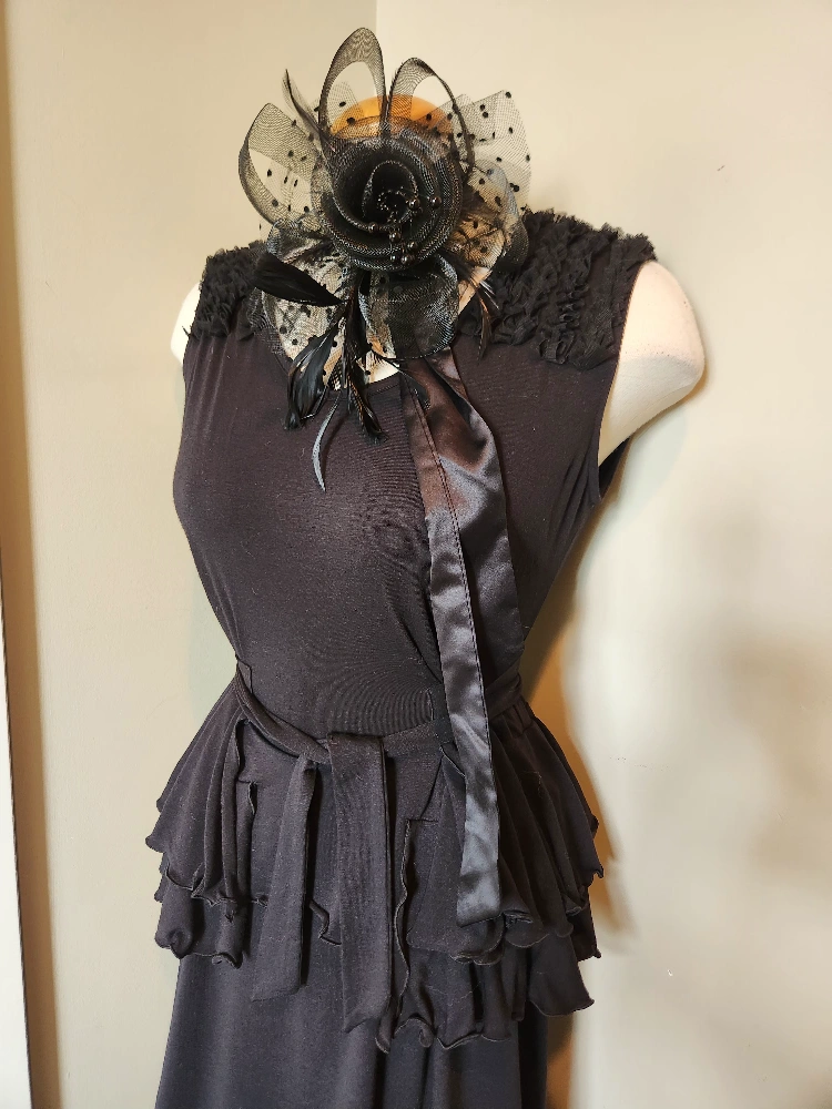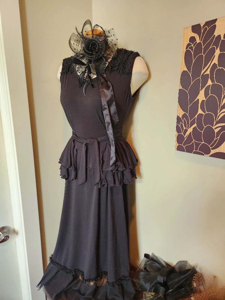 Bought this EFFIE'S HEART dress for $120 years ago, but only wore it once! A stylish 1930's inspired black maxi dress with ruffle detailing, It features a belted waist and stretch fabric that can accomidate size Large to 1x fashionistas! Unique design, also looks great with blouse beneath, or jacket over top. Perfect for a special occasion or a night out! This Holloween friendly dress is also Dark gothic ready and vampire coded. Take it home today.