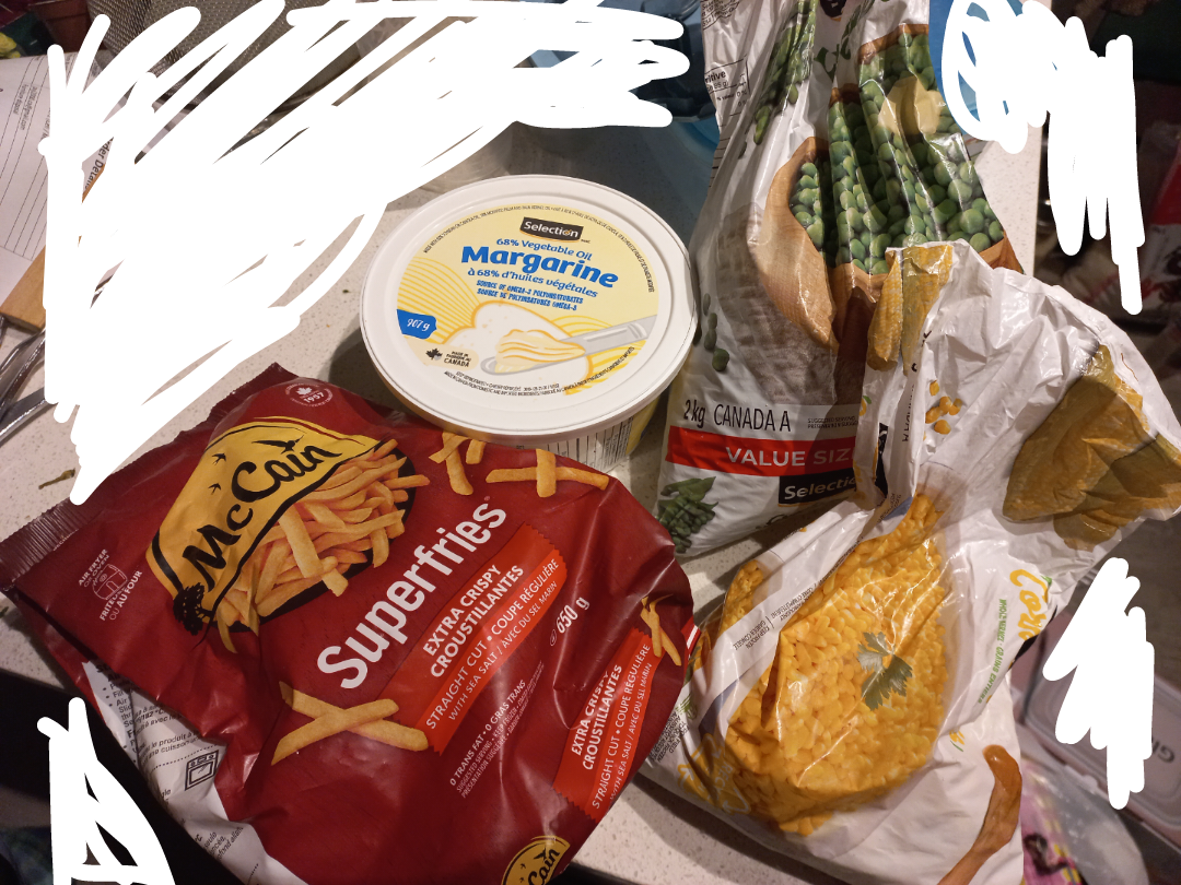 Margarine (new, sealed), McCain Superfries (new, sealed), Pea 1.5kg, Corn